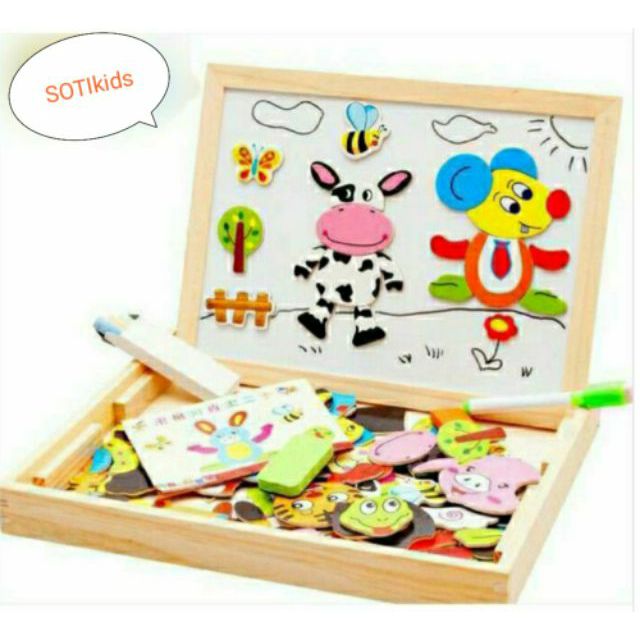 ️**** TẶNG NGAY FILE NGHE TIẾNG ANH (mp3, video các bộ sách nổi tiếng, 100 bài hát, 100 truyện cổ tích...) CỰC KỲ HỮU ÍCH CHO BÉ MỚI BẮT ĐẦU, HƯỚNG DẪN ĐỒNG HÀNH CÙNG CON CHO BỐ MẸ CHƯA BIẾT TIẾNG ANH *** BỘ BẢNG GHÉP HÌNH NAM CHÂM 2 MẶT ❤️ - Kích thước: 30.5*23.5*3.5cm - Trọng lượng: 0,7kg - Chất liệu: gỗ an toàn - Rèn luyện kỹ năng: phối hợp tay và mắt, vận động tinh, phát triển tư duy logic, óc tưởng tượng sáng tạo, kiên trì, tỉ mỉ, khả năng ngôn ngữ, khả năng vẽ, nhận biết thế giới xung quanh... Bộ đồ chơi bao gồm 1 hộp gỗ, 1 bảng, các miếng ghép, hộp phấn và bút. Bé có thể viết và vẽ lên bảng đen trắng nam châm hai mặt. Bản thân hộp gỗ là một hộp lưu trữ, và được thiết kế tinh tế làm cho bảng đen trắng dễ dàng lật lên và nghiêng ở một góc nhất định với hộp, giúp bé dễ dàng chơi và viết/vẽ lên bảng hơn. Với bộ đồ chơi này, bé sẽ nhận biết và phân biệt được các hình dạng và màu sắc, phát triển kỹ năng tư duy không gian, rèn luyện trí tưởng tượng và phát huy hết khả năng sáng tạo của bé. Thông qua trò chơi, bé sẽ hiểu biết thêm về thế giới xung quanh (các con vật, cây cối, nhà cửa, thiên nhiên...), từ đó phát triển ngôn ngữ, khả năng kể chuyện. #dochoigo #dochoigiaoduc #dochoichobe #ghephinh #đồchơigiáodục #đồchơichobé #đồchơithôngminh #đồchơipháttriểntrítuệ #giáodụcsớm #đồchơigỗ