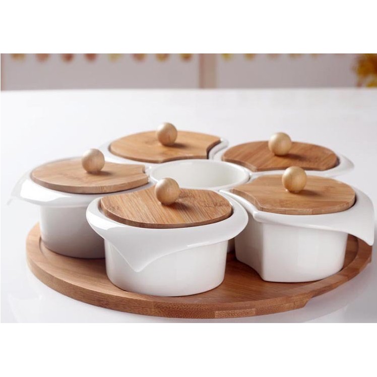 ️Sự kết hợp hoàn hảo giữa gốm sứ cao cấp nhập khẩu hoàn toàn và gỗ thơm tự nhiên đem lại sự tinh tế, nổi bật và khác biệt hoàn toàn so với những sản phẩm khay đựng thông thường. Một chiếc khay nhỏ với thiết kế độc đáo, ấn tượng để đựng bánh kẹo, hoa quả... là một phần không thể thiếu trong phòng khách ấm cúng của mỗi gia đình. Hãy đặt mua ngay cho tổ ấm của bạn 1 bộ khay sứ cao cấp này để bày bánh kẹo ngày Tết. Chắc chắn bạn sẽ hài lòng với chất lượng mà nó mang lại! Chất liệu: gốm sứ cao cấp, gỗ thơm tự nhiên Bộ sản phẩm bao gồm: 1 – khay gỗ; 1 – hũ đựng dĩa; 4 – dĩa nhỏ; 5 – hũ sứ và 5 – nắp đậy bằng gỗ Kích thước: kích thước của từng sản phẩm Khay gỗ đường kính 29,4cm Dĩa nhỏ dài 8cm Hũ tròn đựng dĩa (D x R): 8 x 5,5cm Hũ sứ (D x R): 13 x 7cm