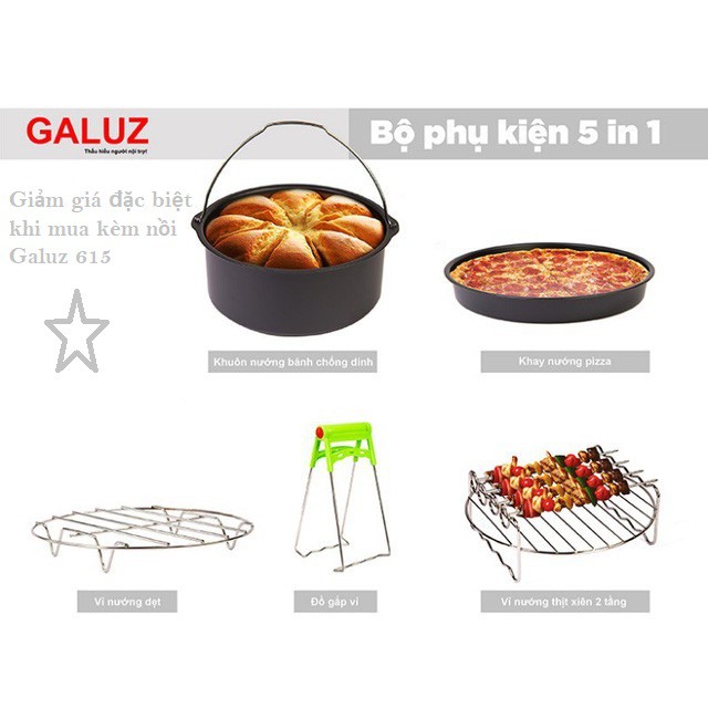 ️Nồi chiên không dầu đang là một sản phẩm không thể thiếu căn bếp mỗi gia đình. Sau chương trình khuyến mại mua nồi Galuz 615 tặng bộ 6 phụ kiện thì rất nhiều khách hỏi và muốn mua bộ phụ kiện này vì sự tiện dụng, đa năng của nó. Để đáp ứng nhu cầu khách hàng, Shop xin giới thiệu bộ dụng cụ này (gồm 5 món, riêng chai xịt dầu đã có tặng kèm theo chương trình khuyến mại của hãng hiện có). Hàng chính hãng Galuz, vừa lòng nồi 5,2l 1. Thùng nướng bánh: ngoài nướng bánh có thể tận dụng để làm các món hầm, soup luôn. 2️. Vỉ tròn: thêm nhiều không gian nấu nướng, có thể nấu cùng lúc với những thực phẩm khác mà không sợ bị ám vị 3️. Dụng cụ gắp bánh, đồ ăn 4️. Vỉ nướng kép: tối đa hóa không gian trong nồi, có các que xiên đi kèm cho các món nướng. 5️. Vỉ nướng dẹt: ngoài việc làm pizza còn có thể tận dụng để làm bánh kếp, chiên trứng #galuz #phukien #lambanh #pizzza