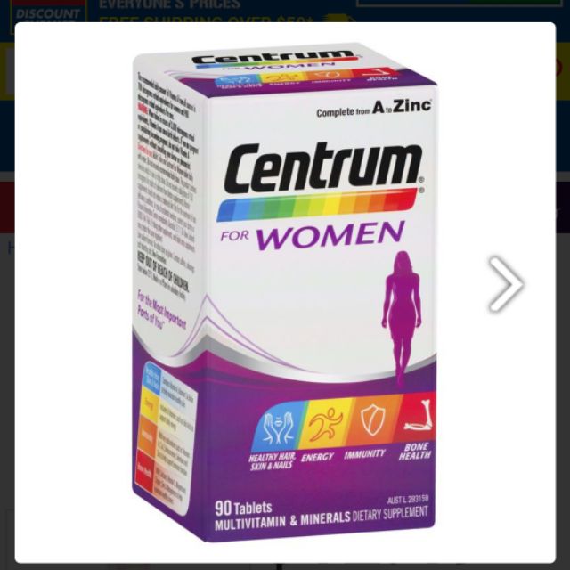 ️Centrum For Women multivitamin and minerals are complete from A to Zinc and support healthy hair, skin and nails, energy, immunity and bone health. For the Most Important Parts of You™. Healthy Hair, Skin & Nails: Contains Vitamin A, Vitamin C & Biotin to help maintain healthy skin. Energy: Includes B Vitamins, such as Folic Acid, to support daily energy. Immunity: With key antioxidants such as Vitamins A, C & E, Betacarotene, Selenium and Zinc to help support immune function. Bone Health: With Calcium, Vitamin D, Magnesium, Copper, Zinc & Manganese to help maintain healthy bones. Suitable For: Women Boxed Contents: 90 Tablets Size: 90 Pack Gender: Female
