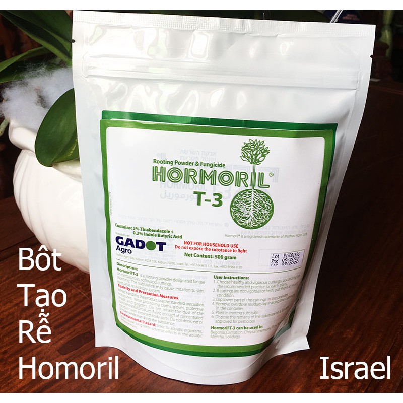 ️– Bột kích rễ Hormoril T3 với thành phần Fungicide ngăn ngừa nấm bệnh, gây hại cây con. Giá tiết kiệm. Dễ sử dụng Hormoril 3 dành cho những cây xanh, thực vật lá màu xanh Hormoril 6 dành cho cả thực vật có màu xanh và cả nhưng cây cành, thân gỗ nhiều gai như hoa hồng ... Hormoril T 3 dành cho những thực vật xanh dễ nhạy cảm với nấm bệnh (fungicide) - Nhập khẩu: Israel. Tên Hormoril 3 và Hormoril T3 (with Fungicide). Thành phần: 5% Thiabendazole + 0.3% Indole Butyric Acid Khối lượng: 500 gram – Chức năng: dùng kích thích ra rễ, giúp rễ cây phát triển nhanh và an toàn 90%. Đặc biệt sử dụng trong kích thích ra rễ cho cây con, cây mầm, giấm chiết cành … Hormoril T-3 có thể sử dụng trên: Thu hải đường (Begonia), hoa cẩm chướng (Carnation), hoa cúc (Chrysanthemum), hoa Phlox (Flox), Sống đời (Kalanchoe), Bạc hà (Mentha), cây họ cúc (Solidago) … 1. CHỨC NĂNG CỦA BỘT TẠO RỄ HORMORIL 3: Là chất điều tiết sinh trưởng thực vật có tác dụng ở phổ rộng, thúc đẩy sự phân chia tế bào và hình thành rễ nhánh, rễ, lá, dùng để tăng nhanh tốc độ giâm trồng và được sử dụng rộng rãi trong việc nhân giống cây nông nghiệp, lâm nghiệp Giúp cây phát triển mạnh hơn, giảm tổn thương khi bị cụt rễ 2. Công Dụng: dùng để giâm cành đạt tỉ lệ thành công cao, rễ ra nhiều và đêu sẽ hình thành một bộ rễ đẹp sau này. Thúc đẩy hình thành rễ thân, rễ nhánh, rễ lá , bởi vậy có thể dùng để thúc đẩy sự mọc rễ của hạt giống, ươm giống sinh rễ Trong thời gian từ 7 ngày – 15 ngày, những cây giống có sử dụng bột tạo kích ra rễ sẽ nhìn thấy sự khác biệt quanh dấu giâm cành 3. Sự khác biệt giữa bột tạo rễ HoRmoril 3 và bột tạo rễ HoRmoril T3 (T with Fungicide) HORMORIL T-3 (bột rễ có chứa thành phần diệt nấm): T with fungicide cực kỳ quan trọng đối với một số giống cây giâm cành nhạy cảm với vi khuẩn bên ngoài. Vì vậy, tùy loại cây cần giâm cành mà nhà vườn chọn lựa Homoril 3 hay Homoril T3 phù hợp