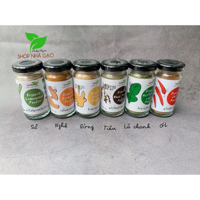 ️Hãng: Lumlum Xuất sứ: Thái Lan Trọng lượng 30g Bột tiêu: Date 11/2019 Bột sả: 04.2021 Bột tỏi: 08/2021 (Mới về Date mới nhất) Bột gừng: 2020 Bột ớt: 04.2021 Bột lá chanh: 04.2020 Bột nghệ: 08.2020
