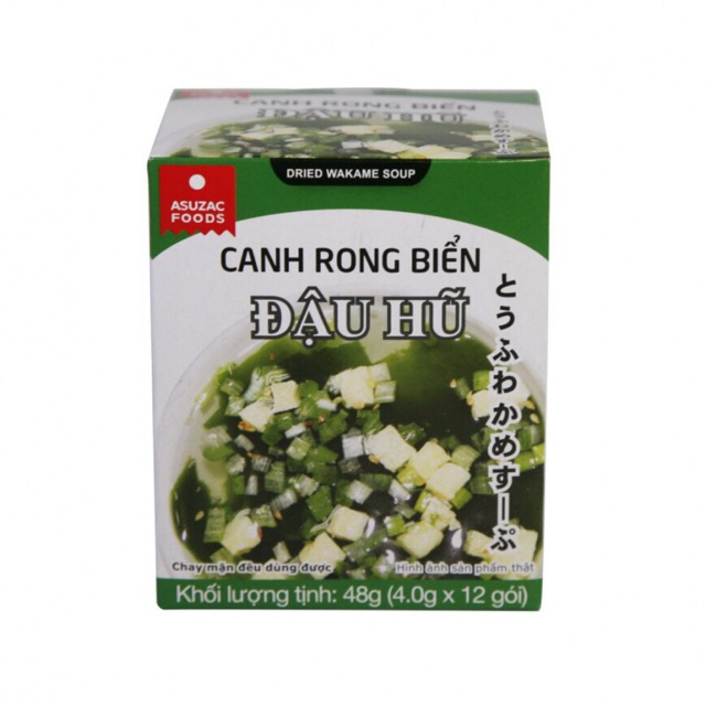 ️Rong biển Wakame là loại rong biển bổ dưỡng của Nhật. Nay được chế biến thành canh, kết hợp với mè và gia vị tạo nên chén canh ăn liền thơm ngon. Chỉ cần chế nước sôi, sau 3p bạn sẽ được chén canh ăn liền hấp dẫn #canhrongbien Thành phần: Rong biển(63%), đậu hũ non (22%), hành baro, mè, gia vị ( muối, đường, chiết xuất nấm men, tiêu) - Hướng dẫn sử dụng: 1. Cho gói canh vào chén 2. Chế nước sôi vừa đủ 3. Trộn đều, chờ 3 phút là dùng được ngày Xuất xứ: Việt Nam San xuất tại CTy TNHH Thực Phẩm Asuzac Hạn sử dụng : 15 tháng