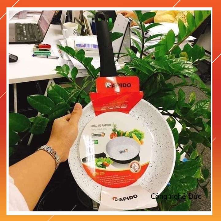 ️Chảo Ferroli- Rapido chuẩn Đức, Size 20 cm, độ sâu lòng vừa phải, lòng chảo phẳng. - Vật liệu chảo: Khác với những loại chảo từ sản xuất theo công nghệ dập khuôn hiện nay, chảo từ Rapido được chế tạo bằng phương pháp đúc nhôm để tạo thành một chiếc chảo nhôm nguyên khối. Ưu điểm của chảo từ Rapido là độ cứng cao, dẫn nhiệt và giữ nhiệt tốt. Từ đó giúp tiết kiệm năng lượng, món ăn chín đều, nhanh hơn, giữ được độ tươi ngon của nguyên liệu. Vì được đúc nguyên khối nên đáy từ không bị phồng đảm bảo độ phẳng tối đa, giúp tiếp xúc với mặt bếp từ tốt nhất. - Lớp phủ chống dính: Chảo từ Rapido được thiết kế tỉ mỉ tới từng chi tiết nhỏ. Bề mặt chảo được xử lý bằng chất liệu chống oxy hóa sau đó được phủ 2 lớp men gốm Ceramic chống dính của Đức màu ngà voi, phẩy đen sang trọng. Đây là loại men chống dính không chứa PFOA an toàn tuyệt đối cho sức khỏe. Lớp chống dính Ceramic 2 lớp siêu bền, không bong tróc, chống xước tốt, có thể sử dụng vật dụng nấu ăn bằng kim loại và rửa trong máy rửa bát. - Đáy tiếp từ cực êm, có thể sử dụng từ bếp than/gas/hồng ngoại và đặc biệt là bếp từ, phân bổ các mặt từ dàn đều kín diện tích bếp, vật liệu tiêu chuẩn, hiệu suất hấp thụ từ cực cao tiết kiệm điện tối đa. - Tay cầm chảo có độ dài vừa phải, chất liệu silicon cầm mềm và êm tay, cách nhiệt. #chảorapido, #chảotừ, #chảogốm #chảochốngdính #ferroli #chảođúc #menceramic #chảobếptừ #28cm
