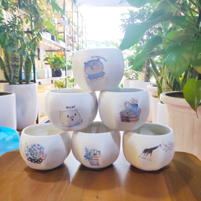 Chậu cây mini in hình - chậu cây văn phòng để bàn, sen đá xương rồng