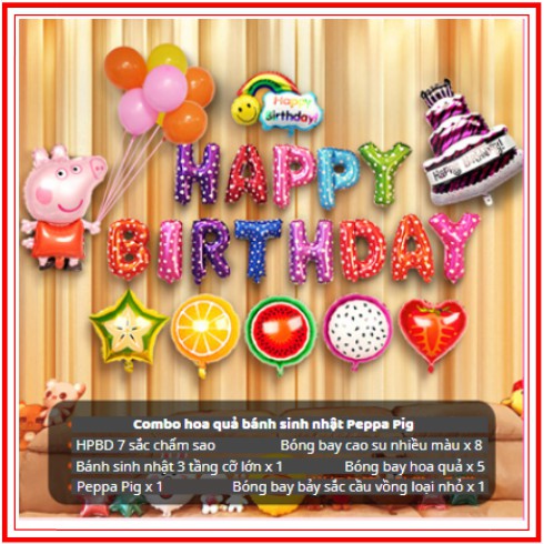 ️Tất cả các sản phẩm đều là hàng có sẵn đã đc chọn lọc quý khách hoàn toàn yên tâm về chất lương sản phẩm. Combo hoa quả bánh sinh nhật Peppa Pig gồm có: HPBD 7 sắc chấm sao Bánh sinh nhật 3 tầng cỡ lớn x 1 Bóng bay cao su nhiều màu x 12 Bóng bay hoa quả x 5 Bóng bay bảy sắc cầu vồng loại nhỏ x 1 Tặng kèm: 1 bơm hơi + 1 ruy băng + 1 keo dán Quý khách hoàn toàn được xem hàng trước khi thanh toán Đảm bao giao hàng cho bên vận chuyển trong 24h kể từ khi đặt hàng, đơn hàng sau 5h chiều ngày hôm sau phát hàng Hỗ trợ đổi trả trong 7 ngày nếu do lỗi của shop hoặc nhà sản xuất -------------------------------------------------------------- Cách sử dụng: Set bóng dùng van khóa 1 chiều. Quý khách chỉ cần bơm căng lên vừa phải rồi rút bơm ra. Hơi sẽ tự động khóa lại. Ko cần dùng dây buộc, có thể dùng nhiều lần, bóng bơm căng có thể để đc 2-3 tháng hoặc lâu hơn. Shop chuyên tư vấn theo tiêu đề hoặc lên ý tưởng các sự kiện Sản phẩm chất lượng như hình quý khách yên tâm khi đặt hàng Đội ngũ nhân viên làm việc chuyên nghiệp tư vấn nhiệt tình nên QUÝ KHÁCH có gì thắc mắc cứ liên lạc nhé Shop mặc định gửi Giao Hàng Nhanh đi các tỉnh trên TOÀN QUỐC ! #bóngbay #trangtrí #sinhnhật #giađình #bétrai #bégái #sựkiện #hônlễ #phòngngủ #ănuống #phòngkhách #settrangtriđẹp#phòngtânhôn#kỉniêmngàycưới#lãngmạn#cầuhôn Sau mỗi đơn hàng,nếu hài lòng về sản phẩm quý khách vui lòng đánh giá shop 5 sao kèm hình ảnh.shop sẽ có phần quà gửi tặng quý khách.Cảm ơn quý khách hàng đã tin tưởng và ủng hộ