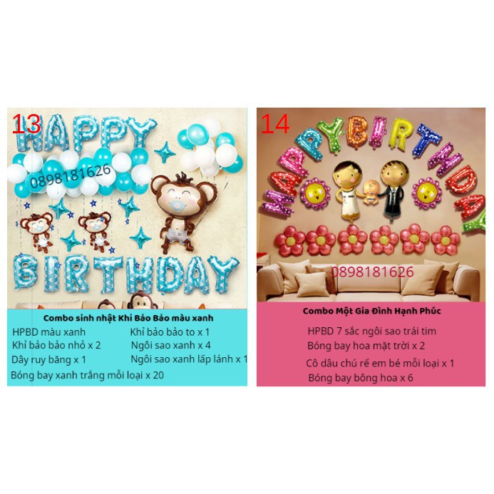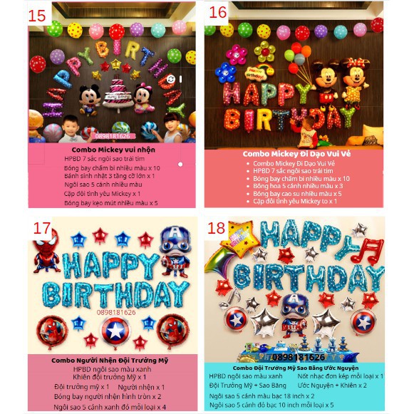 ----Set 13:Combo sinh nhật Khỉ Bảo Bảo màu xanh HPBD màu xanh Khỉ bảo bảo nhỏ x 2 Khỉ bảo bảo to x 1 Ngôi sao 4 cánh xanh 5in x 5 Dây ruy băng x 1 Ngôi sao xanh lấp lánh x 11 Bóng bay xanh trắng mỗi loại x 20 ----Set 14:Combo Một Gia Đình Hạnh Phúc HPBD 7 sắc ngôi sao trái tim Bóng bay hoa mặt trời x 2 Cô dâu chú rể em bé mỗi loại x 1 Bóng bay bông hoa x 6 ----Set 15:Combo Mickey vui nhộn HPBD 7 sắc ngôi sao trái tim Bóng bay chấm bi nhiều màu x 10 Bánh sinh nhật 3 tầng cỡ lớn x 1 Ngôi sao 5 cánh nhiều màu x 5 (2đỏ-3vàng) 10in Cặp đôi tình yêu Mickey x 1 bé Bóng bay kẹo mút nhiều màu x 5 ----Set 16:Combo Mickey Đi Dạo Vui Vẻ HPBD 7 sắc ngôi sao trái tim Bóng bay chấm bi nhiều màu x 20 Bông hoa 5 cánh nhiều màu x 3 (10in) Bóng bay cao su nhiều màu x 5 Cặp đôi tình yêu Mickey to x 1 ----Set 17:Combo Người Nhện Đội Trưởng Mỹ HPBD ngôi sao màu xanh Đội trưởng mỹ x 1 Người nhện x 1 Khiên người nhện hình tròn x 2 Khiên đội trưởng Mỹ x 1 Ngôi sao 5 cánh xanh đỏ mỗi loại x 8(10in) ----Set 18:Combo Đội Trưởng Mỹ Sao Băng Ước Nguyện HPBD ngôi sao màu xanh Nốt nhạc đơn kép mỗi loại x 1 Ngôi sao 5 cánh màu bạc 18 inch x 2 Đội Trưởng Mỹ + Sao Băng Ước Nguyện + Khiên x 2 Ngôi sao 5 cánh đỏ bạc 10 inch mỗi loại x 5 AN TOÀN cho bé thoải mái chơi đùa Cam kết giá rẻ nhất, chất lượng tốt nhất, sản phẩm giống mẫu 100% #trangtrisinhnhat #bongbaysinhnhat #bongsinhnhat #phukiensinhnhat #setbongsinhnhat #sinhnhatchobe #setsinhnhat #phukientrangtrisinhnhat #trangtrísinhnhật #sétbóngsinhnhật #bóngbaysinhnhật #setsinhnhật #phụkiệntrangtrísinhnhật"