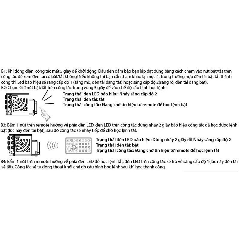 ️Công tắc cảm ứng điều khiển từ xa HOMEMATIC HMX-3C-TIRV1 hỗ trợ remote hồng ngoại Công tắc thông minh HMX-3C-TIRV1 có thể bật tắt đèn từ khoảng cách xa bằng remote hồng ngoại (remote TV, đầu đĩa, quạt,..) thông dụng trong gia đình. Với khả năng học lệnh từ 3 remote hồng ngoại riêng biệt và tương thích với 99% remote hồng ngoại của các thiết bị trên thị trường, bạn có thể dùng nhiều loại remote khác nhau để bật tắt đèn từ xa một cách tiện dụng nhất. Ứng dụng: Nằm giường, ngồi ghế sofa có sẵn remote của TV, đầu đĩa, quạt có thể bật/tắt được luôn đèn mà không cần phải lại gần công tắc để bật/tắt đèn. Một số tính năng: • Cấu tạo nhỏ gọn: phiên bản công tắc điều khiển từ xa HMX-3C-TIRV1 phù hợp với các mặt nắp công tắc hạt tròn phổ biến của nhiều hãng trên thị trường Việt Nam như Sino-Vanlock, Lioa, MPE, Roman, Schneider Electric,v.v… Bạn có thể lắp tối đa 4 công tắc trên 1 mặt nắp. • Cách lắp đặt rất đơn giản, bạn chỉ việc tháo hạt công tắc cũ ra và thay thế hạt công tắc thông minh này vào. • Bật tắt trực tiếp trên công tắc tương tự công tắc truyền thống bằng công nghệ cảm ứng điện dung. Công tắc thông minh HMX-3C-TIRV1 sử dụng chip quản lý chức năng cảm ứng chuyên dụng nên ổn định và chống nhiễu. • Công tắc an toàn: Sẽ không có tình trạng đánh tia lửa điện gây chập cháy như công tắc cơ truyền thống. Công tắc thông minh HMX-3C-TIRV1 cũng sử dụng vật liệu nhựa ABS chống cháy cao cấp cũng như module hóa các thành phần cấu tạo giúp việc sửa chữa bảo dưỡng dễ dàng trong tương lai. Ngoài ra công tắc thông minh HMX-3C-TIRV1 cũng sử dụng chân nối và vít bằng đồng giúp tăng tính dẫn điện, dễ dàng lắp đặt do đi dây gọn gàng trong ổ điện tránh chập cháy. • Thiết kế Led viền benzen tăng tính thẩm mỹ trong nhà bạn: Công tắc thông minh HMX-3C-TIRV1 được thiết kế chức năng led hướng đến trải nghiệm người dùng khi được trang bị Đèn LED phản hồi 2 trạng thái giúp bạn biết trạng thái của công tắc cũng như định vị trong đêm tối. Đèn Led trạng thái này sẽ sáng mờ khi bạn tắt đèn, giúp không bị chói mắt vào buổi đêm mà vẫn định vị được công tắc (và cũng giúp bạn tiết kiệm điện năng tiêu thụ trên công tắc), và sẽ sáng rõ khi bạn bật đèn (do đèn tải chính của bạn đã làm môi trường xung quanh sáng), giúp mắt bạn có trải nghiệm về độ sáng đồng nhất kể cả khi trong phòng đang tối hay sáng. • Khả năng bật/tắt đồng thời bằng 1 nút trên remote hay thiết lập bật và tắt bằng các nút riêng biệt giúp bạn tạo ngữ cảnh nhà thông minh tốt hơn. • Công tắc thông minh sẽ trở về trạng thái off khi mất điện và có điện trở lại, tránh trường hợp thiết bị tự bật lên nhằm tiết kiệm điện. Thông số kỹ thuật: • Điện áp: AC220V 50/60Hz • Công suất tải: Tải trở <1000W|10A(bóng đèn sợi đốt); Tải dung, cảm <300W|3A(đèn huỳnh quang, compact, led) • Công suất tiêu thụ: <1W. • Tần số IR: 38Khz . • Khoảng cách: 8m theo đường thẳng hoặc tổng đường thẳng phản xạ tới công tắc. • Bộ nhớ: Hỗ trợ 3 remote hồng ngoại (6 code bật/tắt riêng biệt) • Kích thước: 42x22x31mm