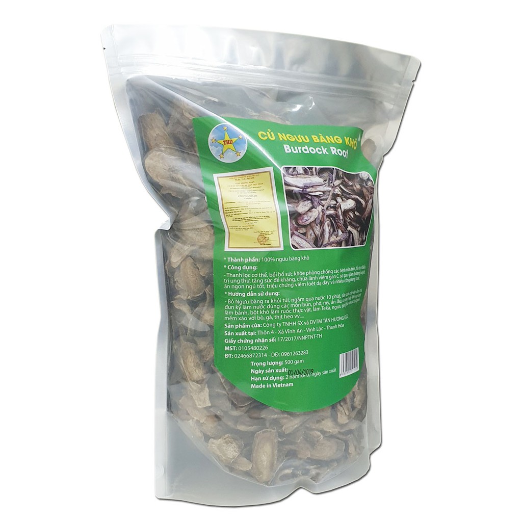 ️Được chế biến từ củ Ngưu Bàng Tươi Việt Nam, trồng tại những vùng nguyên liệu ở bãi giữa sông Hồng, bãi bồi chân cầu Nhật Tân, bãi bồi bên bờ sông Mã (Thanh Hóa) hoàn toàn không sử dụng chất bảo quản. Cách dùng: Có thể sắc từ 40gr đến 60gr trong 1 lít nước, uống 3 tách 1 ngày để chữa bệnh. Ngâm Ngưu Bàng Khô trong nước 10 phút, rửa sạch, đun nước sôi làm trà uống, nấu canh dưỡng sinh hoặc nấu nước lèo dùng cho các món súp, canh, phở, hủ tiếu, lẩu,… • Luộc lấy nước uống để tăng sinh lực và sự dễ chịu cho cơ thể, kiềm hóa dòng máu. • Bọc mì căn sống, chiên vàng rồi rim với tamari: rất nhiều người ưa thích. • Bỏ vào nồi ninh với rau củ, lấy nước ngọt làm món phở. • Bỏ vào món cháo làm cho nồi cháo được dương hóa. • Kho với phổ tai, miso, tương hoặc tamari, với gừng… • Nấu canh dưỡng sinh, phối hợp cùng các nguyên liệu: củ cải trắng, nấm đông cô, cà rốt Trọng lượng: 500g. Công dụng: Ngưu Bàng Khô : Ngưu bàng có tác dụng dường như ngay lập tức trên các ung nhọt thường tái đi tái lại, những hạch chảy mủ, vết bỏng, chứng viêm ở miệng, ở họng. Bệnh hoại huyết, thủy-thủng hoặc các loại kiết lỵ. Tính chất lợi tiểu tiện và lọc huyết của cây ngưu bàng để chữa các bệnh thủy toàn, gút, bệnh kết thạch, mụn nhọt, ghẻ lác xủi như cám và có vảy, mụn sang độc chảy mủ, sài da nổi mẩn, phong thấp, sán thống gan, phổi viêm nước kinh niên, bệnh giang mai thời kỳ thứ 2, thứ 3. Củ ngưu bàng là một thành phần không thể thiếu của canh dưỡng sinh. Ngưu bàng khô ngâm nước lạnh 15phút sau đó cho vào xào với miso và vỏ lá chanh có tác dụng tăng lực, rất tốt cho người bị thấp khớp, tê bại, tiểu đường, viêm sưng, ung loét. Theo Tây y dùng củ ngưu bàng khô có tác dụng thông tiểu, ra mồ hôi, chữa tê thấp, sưng đau khớp và một số bệnh ngoài da như hắc lào, mụn, lở loét. Theo Đông y thường dùng quả ngưu bàng để chữa cảm cúm, thông tiểu, viêm tuyến vú, viêm phổi, viêm họng, viêm tuyến nước bọt, viêm tai, mụn nhọt, sởi, đậu. Theo tài liệu cổ, ngưu bàng có vị cay, đắng, tính hàn, có tác dụng tán phong nhiệt, thanh nhiệt giải độc, tuyên phế, thấu chẩn. Do cây có tính hàn nên người tỳ vị hư hàn, ỉa lỏng không được dùng. Sản phẩm của công ty : Cổ phần Sản xuất và Thương Mại Dịch Vụ Tân Hương Đức Hạn sử dụng : 3 năm kể từ ngày sản xuất. Lưu ý : Sản phẩm không phải là thuốc và không có tác dụng thay thế thuốc chữa bệnh. #Củ_ngưu_bàng #Củ_ngưu_báng #Củ_gobo #cu_nguu_bang_kho #cu_nguu_bang_tuoi