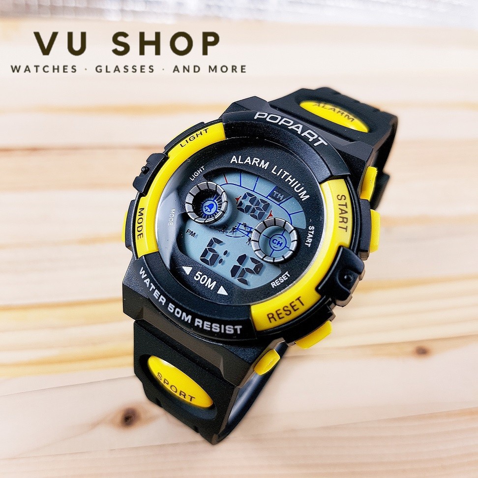 ️Thương hiệu: Popart Màu sắc: Xanh/Vàng. Loại: Digital. Chất liệu kính: Nhựa Chất liệu dây: PU Mô tả thêm chất liệu - kích thước: Dây, vỏ Pu độ bền cao. Thiết kế dây vỏ trong cá tính. Đa chức năng: bấm giờ, báo thức, lịch thứ, ngày, tháng. Đèn LED đổi màu, dễ dàng xem giờ trong tối. Chống nước 3atm. Kích thước mặt: 36mm Bề rộng dây: 20mm Độ dày mặt: 9mm Bảo hành máy: 01 tháng.