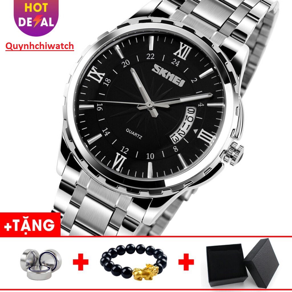 Đồng hồ nam Skmei dây bạc mặt đen cực phong cách hiện đại