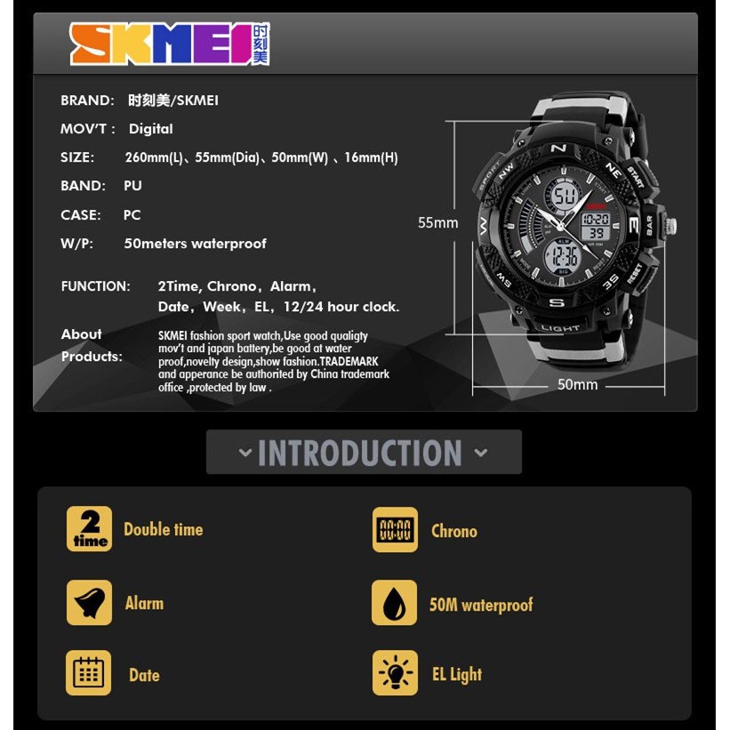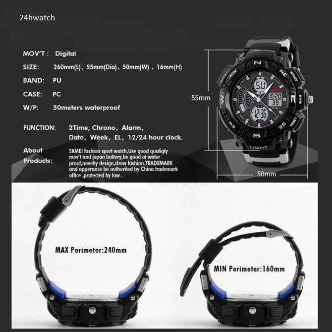 ️➥ Nhấn THEO DÕI shop để được nhận quà tặng, voucher, chương trình rút thăm, quà tặng khách thân thiết nhé. (Quà tặng bất ngờ miễn phí hoàn toàn chỉ dành cho khách đã từng mua hàng và nhấn THEO DÕI TRƯỚC KHI MUA nhé) ---------------☘☘☘ Sản phẩm được phân phối bởi 24hwatch - Chuyên Đồng Hồ Giá Sỉ Đồng hồ Nam Skmei 1211 Motor Sport Đen Công dụng: Quản lý thời gian và thể hiện cá tính. Thương hiệu: Skmei Một mẫu phá cách tuyệt vời nữa mà 24hWatch đem đến cho bạn! Đồng hồ Nam Skmei 1211 Motor Sport - Mẫu đồng hồ phong cách thể thao năng động dành cho bạn nam có kích cỡ tay to. Với chức năng vừa kim vừa điện tử kết hợp tạo nên phong cách độc đáo cùng khả năng quản lý thời gian tuyệt vời với các chức năng báo thức, đo thời gian, xem ngày tháng, xem 2 múi giờ. Đẹp mạnh mẽ với phong cách của bạn! THÔNG TIN SẢN PHẨM Thương hiệu: Skmei Chính Hãng Kiểu máy: Quart Nhật Dành cho: Nam Chất liệu vỏ: Cao Su và Nhựa Chất liệu si: Không si Chất liệu mặt trước: Kính cứng pha khoáng Chất liệu mặt sau: Thép Chất liệu dây: Cao su mềm, êm tay Vành đồng hồ: In chữ Mặt kính: Phẳng Loại mặt: Có lịch; Có số Kích thước mặt: 50cm - 55cm Kích thước dây: 2cm Độ dày mặt: 1.8cm Độ dày dây: 0.2cm Tổng chiều dài: 24cm Số kim: 3 kim + Xem giờ / phút điện tử Số lịch: Lịch ngày / tháng điện tử Độ chịu nước: 5atm - Chịu nước tốt; tránh các hoạt động bơi lội Năng lượng sử dụng: Pin chuẩn Bảo hành: 3 tháng, có kèm phiếu bảo hành. Chức năng: + Theo dõi 2 múi giờ với đồng hồ kim và điện tử + Xem giờ/phút, thứ/ngày/tháng + Hẹn giờ báo thức + Bấm giờ + Đèn led xem buổi tối BỘ SẢN PHẨM BÁN CHUẨN GỒM - 1 Đồng hồ Skmei Chính Hãng - 1 Hộp đựng đồng hồ - 1 Vòng Phong Thủy May Mắn 99K 24hWatch CAM KẾT Mang đến cho khách hàng sự hài lòng nhất khi mua sắm tại 24hWatch Nội dung mô tả sản phẩm CHI TIẾT NHẤT và CHÂN THẬT NHẤT Hình ảnh CHÂN THỰC về sản phẩm Chế độ hẫu mãi và chăm sóc mang lại sự hài lòng sau khi mua sắm Chế độ bảo hành đầy đủ như môt tả sản phẩm. Mọi chi tiết xin liên hệ: 01677988688 Shop ưu đãi giảm giácho khách mua hàng lần 2 nếu khách đánh giá 5* khi mua hàng lần HANG TAG Shop: #24hwatch #uytin #chatluong Ngành hàng: #đồnghồ #dongho #donghodientu #donghothethao #phukiennam #đồnghồđiệntử #thoitrangnam Dành cho: #donghonam Khuyến mãi: #giamgia #rẻ #sale #phagia #bigsale #xahang Thương hiệu: #skmei