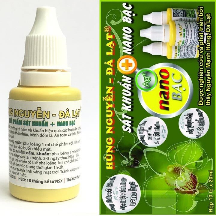 ️Set 5 lọ dung dịch sát khuẩn nano bạc Hùng Nguyễn lọ 20ml Một loại chế phẩm đặc biệt với tính năng sát khuẩn, phòng trừ nấm bệnh hiệu quả, tích hợp các phân tử Nano bạc bảo vệ tốt nhất cho vườn lan nhà bạn. Phòng trị hiệu quả các loại vi khuẩn, nấm bệnh cho phong lan (Bệnh chết nhanh, bệnh thối nhũn, thối nâu…) các loại nấm giá thể… HƯỚNG DẪN SỬ DỤNG CHẾ PHẨM SÁT KHUẨN + NANO BẠC Phun phòng bệnh: Pha loãng mỗi 1 ml chế phẩm (khoảng 20 giọt) với 1 lít nước. Phun ướt đều thân, lá, rễ, giá thể. Từ 7-10 ngày phun một lần. Phun vào buổi sáng sớm hoặc buổi chiều mát. Phù hợp cho mọi độ tuổi và mọi loại lan từ lúc mới ghép đến cây trưởng thành. Có thể phun vào mọi thời điểm trong năm. Trừ mùa nghỉ và lúc ra hoa. Công thức phòng trị nấm khuẩn đặc biệt kết hợp các phân tử Nano Bạc có trong chế phẩm giúp vườn cây khỏe mạnh, tăng sức đề kháng và giảm thiểu các rủi ro bệnh tật. Nhờ đó cây tăng trưởng và phát triển ổn định. Phun trị bệnh: Đối với lan đã nhiễm nấm, khuẩn (bệnh chết nhanh, bệnh thối nhũn, thối nâu…) Lưu ý trước khi phun: Nên cách ly giò lan bị bệnh sang nơi điều trị có mái che tránh mưa. Ngừng tưới nước và ngừng bón phân. Pha loãng 1 ml chế phẩm với 100 ml nước (hoặc 10 ml chế phẩm với 1 lít nước). Phun từ 02 đến 03 ngày 1 lần ướt đẫm toàn bộ giò lan, đặc biệt mặt dưới lá nếu bệnh trên lá. Đến khi vết bệnh khô hẳn hoặc lá bị bệnh vàng rồi rụng đi. Đối với nấm trắng trên giá thể có thể pha 1 ml chế phẩm với 1 lít nước và ngâm toàn bộ giò lan vào dung dịch từ 1-2h để diệt nấm hiệu quả hơn. Nấm chuyển từ màu trắng sang màu nâu đỏ và tự phân hủy thành chất dinh dưỡng cho lan. Cảnh báo nguy hại: Chế phẩm an toàn và thân thiện với môi trường. Tuy nhiên không dùng cho cây thực phẩm: RAU, CỦ, QUẢ. Không dùng chế phẩm cho người và động vật (không uống và nhỏ mắt) Để xa tầm tay trẻ em Bảo quản: Bảo quản chỗ tối và mát, tránh ánh sáng mặt trời.