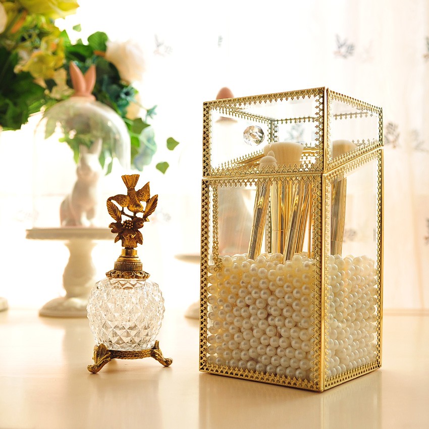 ️Hộp đựng cọ có nắp mạ viền kim loại - Kích thước : cao 21 cm x chiều rộng 10 cm x chiều dài 10 cm - Hộp đựng cọ viền kính 5 li, mạ kim loại màu vàng, - Hộp kèm 1 túi hạt