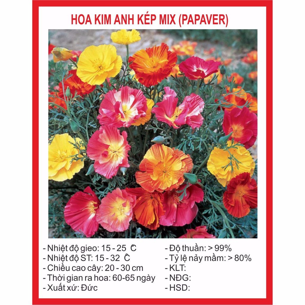 ️Hãy bấm THEO DÕI shop để cập nhật những sản phẩm yêu thích với giá hấp dẫn! - SHOP Hạt giống - Mua sắm thả ga, giá cả tốt nhất ! - Giao hàng TOÀN QUỐC - Thanh toán khi nhận hàng COD ---------------------------------------------- * GIỚI THIỆU SẢN PHẨM - Số hạt/gói: 50 Hạt - Tỷ lệ nẩy mầm: >80% - Mùa Vụ: quanh năm - Nhiệt độ gieo: 15 - 30 độ - Nhiệt độ ST: 15 - 35 độ - Thời gian ra hoa: 80-90 ngày ---------------------------------------------- * HƯỚNG DẪN TRỒNG ĐƠN GIẢN 1. Chuẩn bị vật dụng - chất trồng: -Chậu nhỏ (hoặc chậu to nếu sau này không muốn thay chậu nữa) hoặc khay ươm nếu gieo số lượng nhiều. Dù bạn dự tính trồng thẳng trong chậu hoặc sẽ chuyển xuống đất trồng thì cũng nên uơm hạt trong chậu trước vì dễ quản lí đô ẩm, sâu bệnh, dinh dưỡng... -Thuốc trừ nấm. -Đất sạch giàu dinh dưỡng + vỏ trấu hoặc xơ dừa, mụn xơ dừa, (đã hoai mục), phân gà, phân bò... Thông thường tỷ lệ phổ biến như sau: Đất sạch - vỏ trấu, xơ dừa, phân gà, bò = 7 : 3 - Hoặc có thể dùng đất sạch đóng bao sẵn – mua ở cửa hàng 2. Tiến hành gieo hạt:. -Chất trồng sau khi trộn đều, chúng ta cho vào chậu hoặc khay uơm. -Phun thuốc trừ nấm lên mặt chất trồng (bước này khá quan trọng), tốt nhất phun liên tục 2-3 lần để thuốc thấm xuống sâu hơn. (nếu mua đất sạch thì không cần) -Ngâm hạt:Ngâm hạt trong nước 3 sôi 7 lạnh trong 5-7h -Sau khi ngâm hạt dùng giấy ướt (có thể dùng giấy vệ sinh gấp lại thành nhiều lớp) để ủ hạt (cho hạt vào giấy, và gấp đôi chúng lại), sau đó cho vào 1 hộp nhỏ, rồi đậy kín lại và cho vào chỗ mát mẻ (luôn để giấy ở trạng thái ẩm cao). Để như vậy đến khi hạt nhú mầm xanh(tùy hạt mà từ 5-15 ngày) thì mang gieo ra đất đã được làm tơi xốp – nhớ làm nhẹ tay kẻo gẫy mầm nhé! (thường áp dụng cho các loại hạt yêu cầu kĩ thuật xíu:hạt giống hoa các loại, dâu tây, nho, hồng ri ba tư, nho gỗ, tử đằng... 3. Chăm sóc sau khi gieo hạt: -Nhiệt độ:tùy loại mà nhiệt độ để nẩy mầm dao động từ khoảng 20-30oC. Không cần quá chú trọng đến vấn đề này vì chỉ cần che lưới là ổn rồi. -Độ ẩm của đất trồng:luôn đảm bảo độ ẩm cho đất, không được để đất bị khô hoặc quá ẩm -Đặt chậu hoặc khay uơm ở nơi có ánh sáng khuyếch tán (che lưới lan màu đen loại 50%), vì hạt cần ánh sáng để nẩy mầm, nhưng nếu cường độ quá mạnh sẽ đốt cháy hạt và làm khô chất trồng nhanh chóng -Thay chậu hoặc chuyển vào đất trồng: khi cây con đã lớn (thân đủ cứng cáp, rễ mạnh...), chúng ta có thể chuyển qua chậu to hơn hoặc chuyển xuống đất trồng trực tiếp. Nếu trước đó đã gieo hạt trong chậu to thì không cần sang chậu. Chú ý bón lót phân hữu cơ vào đất trồng. -------------------------------------------------------------- SDT:0898.319.473 --------------------------------------------------------------- #Câycảnhvàhạtgiống #caycanhvahatgiong #hatgiong #hạtgiống #hoakimanh