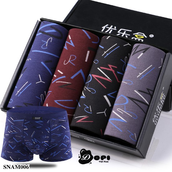 ️Hộp 4 quần lót nam, quần lót boxer nam, sịp đùi nam cao cấp SNAM006 - Nhãn hiệu: Youlehe - Xuất sứ: Quảng Châu, Trung Quốc - Sản phẩm nguyên vẹn, có đầy đủ tem mác, hộp đi kèm (từ 21/6/2019 sản phẩm sẽ ko có túi đi kèm) - Chất liệu: 95% cotton, 5% spandex - Vải mềm mịn, ko xù, ko nhăn, co dãn 4 chiều - Giặt ko phai màu - Đường may chắc chắn, dáng dài đến đùi, form ôm sát body trẻ trung - Cạp chun bản rộng co giãn, không gây hằn trên da. - Có 4 size: L, XL, XXL, XXXL - 1 hộp có 4 màu cùng 1 kiểu họa tiết - Hàng có sẵn - Mọi thắc mắc xin liên hệ fanpage: Dopi Việt Nam - Hoặc sdt: 0868828659 #quansipnam #thoitrangnam #boxer #quanlotnam #thoitrangnam #quanlotcaocap