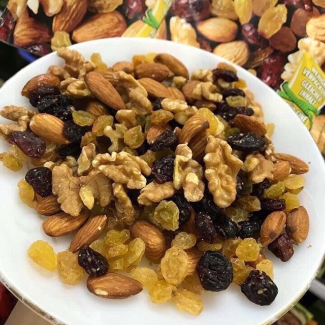 ️??hạt và hoa quả sấy khô thập cẩm Trọng lượng : 150g Bao gồm: -> Nho khô -> Việt quất khô -> Óc chó -> Hạt dẻ hạt bí xanh , táo đỏ , hạt điều ... Quá hợp lý cho các bác mua về ăn tết và nếm thử các loại hoa quả khô giàu dinh dưỡng và tốt cho sức khoẻ