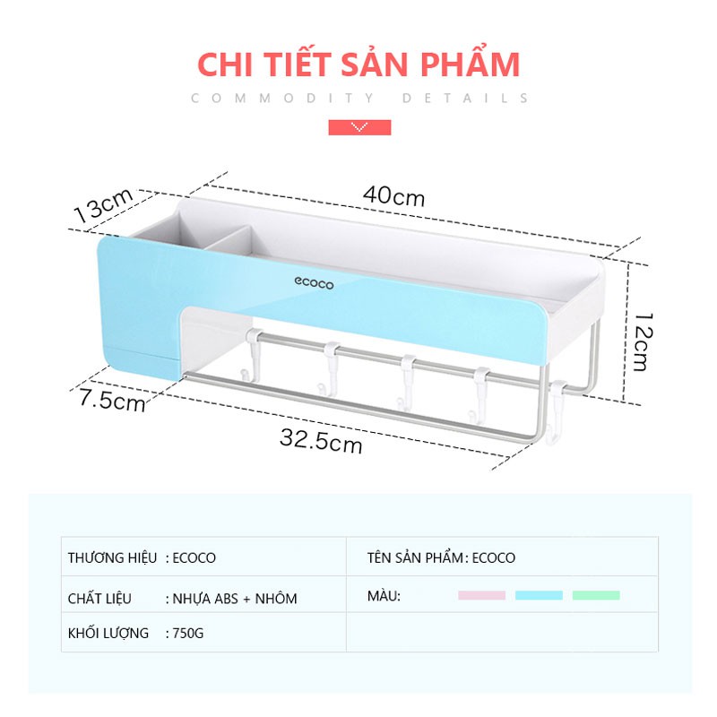 ️Kệ đựng đồ nhà tắm kết hợp treo khăn 9232 • Thông tin chi tiết: • Thương hiệu: Ecoco • Chất liệu: Nhựa ABS, nhôm • Kích thước: 40 x 12 x 13cm (dài x rộng x cao) • Khả năng chịu tải tối đa: 8kg • Màu sắc: Xanh biển, Xanh lá, Hồng Ưu điểm: - Kệ được làm từ nhựa ABS, bền đẹp cho thời gian sử dụng lâu dài. Các thanh ngang treo khăn được làm từ nhôm nguyên khối, khả năng chống ôxi hóa tuyệt đối. - Diện tích mặt trên kệ được thiết kế thông minh, giúp bạn sắp xếp các dụng cụ phòng tắm được gọn gàng, ngăn nắp. - Với thiết kế nam châm, xà phòng cục được treo một cách thuận lợi cho việc sử dụng nhiều lần. - Ngoài ra kệ được thiết kế 1 ngăn kéo nhỏ cất giữ nữ trang khi tắm. - Kệ được lắp đặt dễ dàng bằng miếng keo dán đi kèm, không cần khoan tường bắt vít. Tải trọng tối đa lên đến 8kg. Lưu ý: - Keo chỉ sử dụng được trên các bề mặt phẳng, láng mịn, không gồ ghề như: gạch men, kính, gỗ… - Để đảm bảo keo dán được chắc chắn, vui lòng sử dụng kệ sau khi dán keo 24 giờ. - Bạn có thể dịch chuyển kệ sang vị trí khác bằng cách sử dụng máy sáy hơ keo dán để tháo gỡ miếng keo.