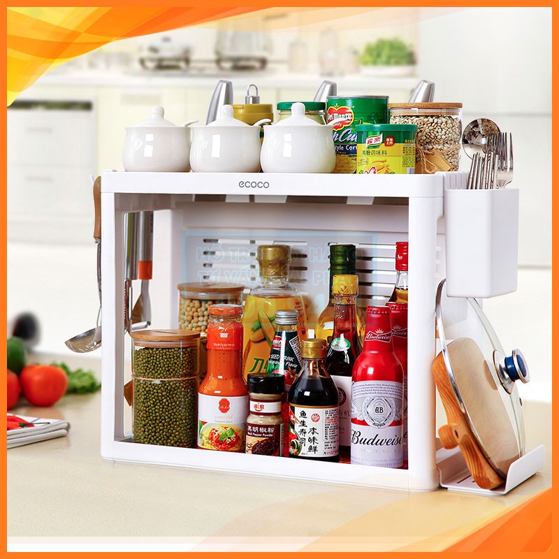 ️Thông tin sản phẩm: • Chất liệu: Nhựa PP + PC cao cấp. • Kích thước sản phẩm: 42 x 22 x 35 cm (dài x rộng x cao). • Màu sắc: Trắng. • Bộ sản phẩm: thiết kế 2 tầng Sản phẩm nhà bếp luôn là món đồ mà chị em phụ nữ săn lùng, mỗi sản phẩm đều có ý nghĩa, vai trò riêng trong việc tạo nên những món ăn ngon và bổ dưỡng cho gia đình. Chính vì thế, buongiagoc.com mang đến cho các chị em một vật dụng vô cùng thiết thực; chính là Kệ gia vị 2 tầng Ecoco. Cùng khám phá xem chiếc kệ này có gì đặc biệt nhé. Kệ gia vị 2 tầng Ecoco được thiết kế như một vật dụng để thu gọn những món đồ cần thiết cho việc nấu nướng. Nếu bình thường bạn phải để gia vị một nơi, các loại vá, muống nấu nướng nơi khác thì giờ đây việc nấu ăn sẽ trở nên gọn gàng và nhanh chóng hơn rất nhiều. Với thiết kế 2 tầng, tầng dưới bạn có thể để các chai lọ cao như chai nước mắm, nước tương, tương cà… Tầng trên thì có thể để các hủ thấp đựng gia vị như: tiêu, bột ngọt, đường,… vô cùng tiện nhé. Ngoài ra kệ còn gồm nhiều móc treo giúp bạn có thể treo vá hoặc muỗng lớn, dao, kéo và phụ kiện bếp khác; cũng có thêm phần mở rộng thêm để đựng thớt hoặc cái mâm.Thật là tuyệt vời, bạn sẽ có thể thoải mái sắp xếp vật dụng khoa học và hợp lý, tiết kiệm không gian một cách hữu hiệu, mang lại cảm giác ngăn nắp cho không gian bếp nhà bạn. Kệ có màu trắng nhã nhặn, sang trọng sẽ làm cho góc bếp trở nên gọn gàng, sáng bóng. Các chị em sẽ thắc mắc sau không thiết kế thêm nhiều màu cho đa dạng và sạch hơn. Mặc dù là màu trắng, nhưng với chất liệu nhựa cao cấp ít bám bụi và dễ dàng lau chùi bằng khăn ướt hoặc vệ sinh bằng nước.