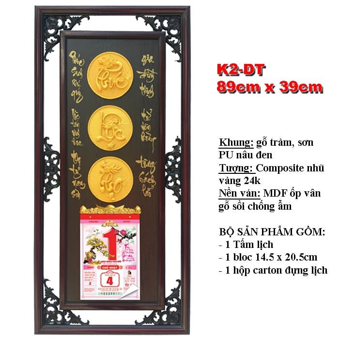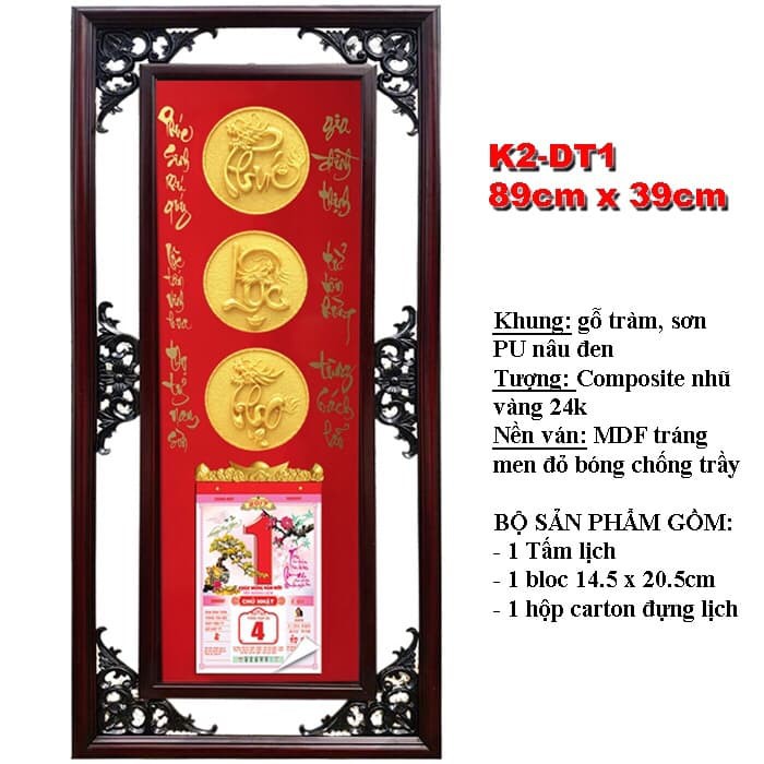 ️#Khung #Tranh #Lịch #Gỗ #Phù #Điêu #Khắc #Nổi #Phúc #Lộc #Thọ - Màu Đỏ Lịch tết với mỗi dân tộc mang một ý nghĩa rất đặc biệt. Không chỉ bởi đó là lúc mỗi người đều ý thức về thời gian đã đi qua, bỏ lại sau lưng những điều không may mắn để khởi đầu cho một năm mới. Đó còn là một điều lý tưởng để duy trì nét đẹp, một trong những phong tục đã được duy trì từ bao thế kỷ qua không bị mai một. Phong tục #TẶNG #LỊCH #TẾT. Tặng lịch tết cho nhau mỗi dịp xuân về là một nép đẹp vốn có từ lâu đời của dân tộc ta. Hình ảnh ba chữ ” Phúc Lộc Thọ” rất quen thuộc và gần gũi với mọi gia đình, dù kinh doanh hay trong cuộc sống thì các vị thần tiên này cũng được người dân quý mến, kính trọng và hay treo ảnh thờ trong nhà để cầu tài lộc, may mắn _Chữ “Phúc” thường chứ phúc được chép lên tờ giấy đỏ. Quan niệm rằng ai sở hữu chữ phúc, vừa có phúc lớn vừa có, may mắn đỏ cả năm. Với chữ "Lộc" như tài lộc lấn tới, an lành lộc lá . Đặc biệt chữ lộc không thể thiếu trong các dịp tết đến xuân sang. Người ta hay dùng chữ lộc làm câu chúc tụng nhau, chúc cho nhau nhiều tài, nhiều lộc. _ Chữ lộc cũng là bước ngoặt lớn nhất của đời người, đó chính là tài lộc dồi dào. Lộc cũng mang hàm ý may mắn, phát đạt. Thường treo tranh chữ phúc để cầu mong vận may, tài lộc sẽ đến với mỗi chúng ta _Chữ "Thọ" thường là chúc nhau thêm một tuổi mới, thọ thêm một tuổi, thọ mãi, thọ mãi. Ý nghĩa to lớn nhất chữ thọ hay được con cháu dùng đến để chúc thọ ông bà sống lâu chăm tuổi, bách niên giai lão. Với Sản phẩm Tranh Phù Điêu Khắc Nổi Phúc Lộc Thọ bạn có thể: _Là một món quà tặng cực ký ý nghĩa trong dịp năm mới _Một món quà tặng ý nghĩa cho Sếp, Nhân viên, Khách hàng, người thân… _Là một vật trang trí mang đến sự sang trọng và đẳng cấp cho gia đình _Mang Tài Lộc, May Mắn, Thịnh Vượng đến cho gia đình bạn. Tranh Phù Điêu Khắc Nổi Phúc Lộc Thọ - Màu Đỏ THÔNG SỐ SẢN PHẨM: - Kích thước: 90x40cm - Chất liệu khung: Gỗ tràm - Chất liệu nền: Gỗ MDF -Chất liệu chữ: - Vật liệu composite -SƠn nhũ vàng -TẶNG Bloc lịch đại 15x21cm