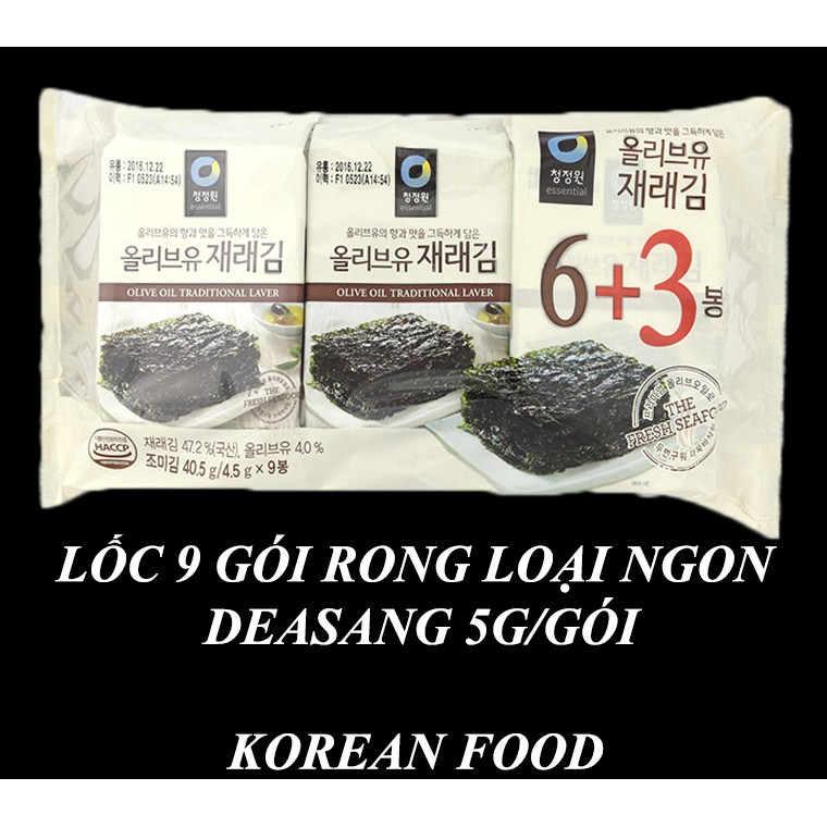 + LỐC 9 GÓI RONG BIỂN ĂN LIỀN DEASANG LOẠI NGON 5G/GÓI được chế biến cùng với dầu mè, dầu olive,… được xử lý qua công nghệ hiện đại nên vẫn giữ nguyên được hương vị thơm ngon của món quà biển.
