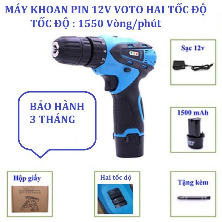 ️Máy khoan pin hai tốc độ VOTO 12 V-Tặng kèm đầu vít – Chức năng: Khoan ,Bắt vít. – Chức năng khoan : 700 vòng/phút – tự ngắt khi kẹt mũi – Chế độ bắt vít : 18 cấp trượt (không trờn răng) ,Cò (có điều tốc) – Đèn led soi sáng : Có – Tốc độ không tải: 700 vòng/phút – Mô men xoắn cực đại: 28N.m – Sử dụng mũi khoan 0.8mm ->10mm. Trong hộp giấy: 01 thân máy khoan,01 pin sạc ,01 adapter, 01 đầu vít Hàng mới 100%, sử dụng Nhông kim loại + Motor cuộn dây đồng bền bỉ, chất lượng tốt Mọi chi tiết xin liên hệ Zalo : 0979222725 #maykhoanpin #khoanpin #maybanvit #vanvit #voto,maybatvit45chitiet,#joustmax,#maykhoanpinaotou,#maykhoankhongday,#maykhoancamtay