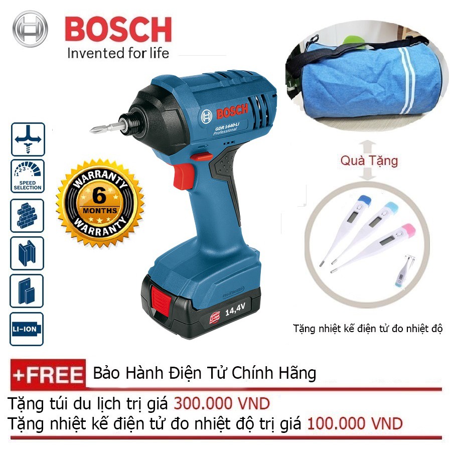 ️Máy khoan bắt vặn vít dùng pin GDR 1440 LI được trang bị công nghệ tiên tiến mới nhất cho hiệu quả cao trong tất cả các công việc. Nổi bật với chức năng điều khiển tốc độ điện tử cho phép người dùng tự điều chỉnh tốc độ phù hợp với mọi yêu cầu thi công trên nhiều bề mặt khác nhau. Máy khoan Bosch GDR 1440 LI là công cụ chuyên nghiệp được thiết kế dành riêng cho việc khoăn bắt, vặn vít dễ dàng và thuận tiện kể cả với những người mới sử dụng Máy khoan vặn vít dùng pin Bosch GDR 1440-LI được sản xuất theo dây chuyền công nghệ cao cấp của châu Âu đảm bảo những tiêu chuẩn & Chất lượng cao nhất mang tới khả năng ứng dụng mạnh mẽ trong các công trình xây dựng, các xưởng gia công, những công việc sửa sữa của ngững tay thợ lành nghề và là một công cụ không thể thiếu trong gia đình khi có nhu cầu sửa chữa các vật dụng trong ngôi nhà. Nếu bạn vẫn còn sử dụng các dụng cụ thủ công như búa, tuốc vít để vặn ốc hay đóng đinh vào tường khi muốn trang trí lại một vài bức tranh, kệ sách, chỉnh lại cái đồng hồ treo tường đã xộc xệch hoay đơn giản là vặn lại ốc vít tại góc cửa đã bị bung ra và bực mình khi con ốc, đinh vít của bạn không chịu nghe lời bạn, đinh ốc bị cong khi đóng vào tường, ốc vít đã lâu ngày không thể nào vặn ra được thì đã đến lúc thì bạn cần phải thay đổi. Hãy sắm ngay cho gia đình của mình một chiếc máy vặn vít dùng pin Bosch GDR 1440-LI bỏ túi để trang hoàng lại không gian gia đình một cách quy củ và theo ý của bạn. Máy vặn vít dùng pin cầm tay GDR 1440-LI cho khả năng thao tác đơn giản bằng cả 1 tay đặc biệt những khu vực có không gian chật hẹp hoặc vị trí các máy khoan Bosch thông thường khác khó thao tác nhờ thiết kế nhỏ gọn với tổng trọng lượng chỉ 1,2 kg. Kích thước chiều dài đầu máy 153mm, chiều cao thân máy 231mm cho khả năng hoạt động linh hoạt, di chuyển, thao tác và cất giữ dễ dàng. Ngoài ra thiết kế báng tay cầm bằng cao su mềm mại, dễ dàng cầm, nắm đặc biệt với những mối vít trên đỉnh đầu, chỉ với chiếc máy khoan pin vặn vít Bosch GDR 1440 LI bạn không cần phải mất công kéo ghế, bắc thang để tiến hành các công việc ở trên cao quá đầu, chỉ cần giơ máy lên cao bằng một tay và điều khiển công tắc bật/ tắt, bạn đã có ngay kết quả hoàn toàn mỹ mãn. Máy vặn vít Bosch GDR 1440 LI có khả năng chọn trước tốc độ thi công nhờ chức năng điều khiển tốc độ điện tử giúp người sử dụng làm chủ công việc, nâng cao năng suất lao động. Lực nhấn nhẹ lên công tắc Tắt/Mở 7 tạo ra tốc độ quay thấp. Tăng lực nhấn lên công tắc làm tăng tốc độ quay.Ngoài ra GDR 1440 LI còn sử dụng chức năng đảo chiều hỗ trợ tối ưu cho việc vặn vít và tháo vít.Tổng quan thông số máy khoan pin Bosch GDR 1440-LI Bảo hành: 6 tháng Mô-men xoắn, tối đa (cứng/mềm) 30 / 15 Nm Tốc độ không tải (số thứ 1 / số thứ 2) 0 – 420 / 0 – 1400 vòng/phút Khả năng của đầu cặp, tối đa/tối thiểu 1 – 10 mm Điện áp pin 14.4 V Các thiết lập mô-men xoắn 25+1 Đường kính khoan – Đường kính khoan tối đa trên gỗ 25 mm – Đường kính khoan tối đa trên thép 10 mm Đường kính vít – Đường kính vít tối đa 7 mm