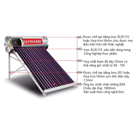 ️Giá sản phẩm đã giảm 1.000.000 VNĐ từ tập đoàn Điện Lực EVN và bao gồm 10% thuế VAT. Miễn phí lắp đặt ,vận chuyển trên toàn quốc. Hãy liên hệ 0979 880 459 để nhận được giá ưu đãi hơn. Cấu tạo ✔ Bình bảo ôn: › Đường kính Ø460 mm. › Vỏ bình: Được sản xuất bằng nguyên liệu inox SUS 304/BA chịu được các thời tiết khắc nghiệt. › Ruột bình: Được sản xuất bằng chất liệu inox SUS 316 siêu cấp, thách thức mọi nguồn nước, có độ bền vượt trội. › Lớp bảo ôn: Giữ nhiệt bằng hợp chất foam (độ dầy 55mm) giữ nhiệt lên đến 96 giờ. ✔ Ống thu nhiệt chân không Ø58: › Đường kính ống: Ø58 - Chiều dài ống: 1800mm - Sản xuất theo công nghệ Đức. › Được cấu tạp với ống thủy tinh tích nhiệt chân không, đặc biệt cứng - chịu va đập cao, ở giữa là chân không. Thân ống bên trong được tráng màng kim loại đặc biệt gồm 5 lớp: Ống chân không Máy nước nóng năng lượng mặt trời Đại Thành - Lớp 1: Lớp ngoài cùng là lớp thủy tinh trong suốt, ánh nắng dễ dàng tiếp xúc và truyền dẫn nhiệt. - Lớp 2: Truyền nhiệt cao (Hợp kim đồng). - Lớp 3: Chống bức xạ tia hồng ngoại và làm sạch nước (Titan Dioxit). - Lớp 4: Hấp thụ 99.5% ánh sáng mặt trời (Hợp kim nhôm). - Lớp 5: Lớp chống bám cặn - giúp cho mặt trong của ống Đại Thành không bị bám cặn bẩn. PHỤ KIỆN MÁY NƯỚC NÓNG NĂNG LƯỢNG MẶT TRỜI ĐẠI THÀNH VIGO F58 STT Sản phẩm Đơn vị Số lượng 1 Ống 25 x 4.2 Ống 4 2 Co ren trong 25 x ¾ Cái 3 3 Co ren trong 25 x ½ Cái 1 4 Co ren ngoài 25 x ½ Cái 2 5 Măng sông ren trong 25 x ½ Cái 1 6 Măng sông ren ngoài 25 x ¾ Cái 1 7 T25 Cái 2 8 Cút 25 Cái 5 9 Măng sông 25 Cái 2 10 Van nhựa bi nhựa 25 x ½ Cái 1 ĐẠI THÀNH – VIGO Φ70 Dung tính - ống Giá niêm yết Giá bán cho khách hàng 150L - Φ 70-10 ống 9.840.000 7,450,000đ 180L - Φ 70-12 ống 11.550.000 8,600,000đ 210L - Φ 70-14 ống 13.210.000 10,000,000đ 225L - Φ 70-15 ống 13.960.000 10,500,000đ 240L - Φ 70-16 ống 14.770.000 11,500,000đ 270L - Φ 70-18 ống 16.380.000 12,600,000đ 300L - Φ 70-20 ống 18.080.000 14,600,000đ 315L - Φ 70-21 ống 18.840.000 14,900,000đ 360L - Φ 70-24 ống 21.300.000 18,000,000đ #mnl #mllmt #bonnangluong #maynangluongmattroi #daithanh #maynuocnong #vigo #sus316 #binhbaoon #maynuocnong #binhbaoon #tietkiemdien