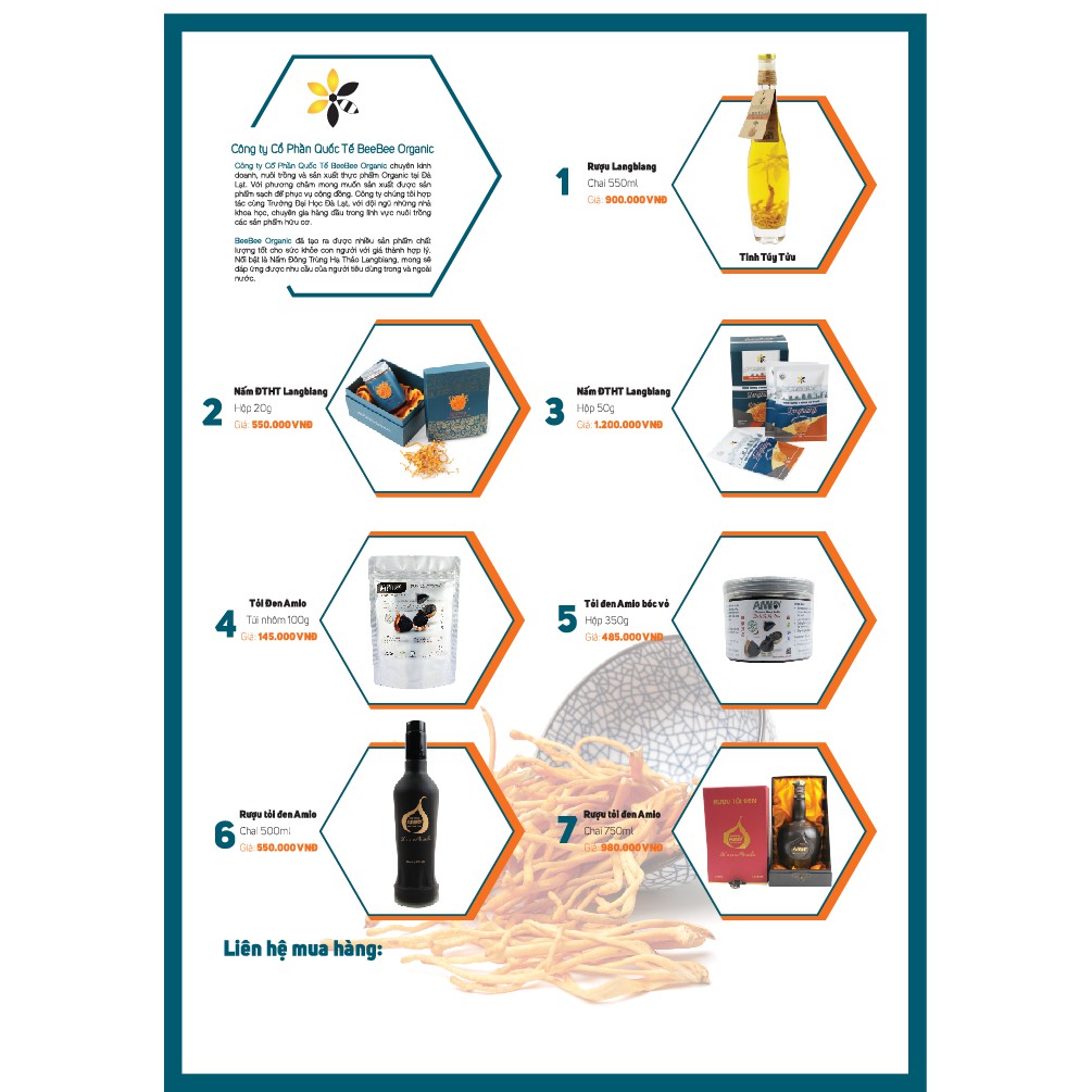 ️*Thành phần: Đông Trùng Hạ Thảo (Cordyceps Militaris) *Trọng lượng: Nấm đông trùng hạ thảo Langbiang túi 2g *Công dụng: -Tăng cường chức năng thận, phổi -Hỗ trợ phòng chống ung thư -Tăng cường chức năng sinh lý và hỗ trợ điều trị vô sinh -Điều hòa đường huyết phòng chống tiểu đường -Tăng cường các hoạt động trao đổi chất trong cơ thể và tăng sức đề kháng cho cơ thể -Giúp trẻ hóa tế bào da hồng hào -Giảm mệt mỏi stress, giảm cholesterol *Hướng dẫn sử dụng: nấm đông trùng hạ thảo Langbiang được sử dụng bằng nhiều cách như: hãm trà dùng, ngâm rượu, ngâm mật ong, nấu cháo, nấu canh hầm chung với xương thịt, đặc biệt khi dùng chung với các món lẩu để đạt được giá trị ẩm thực ngon nhất. *Đối tượng sử dụng: phù hợp cho mọi đối tượng và giới tính, hạn chế dùng cho trẻ em dưới 5 tuổi. Dùng được cho người ăn chay. *Xuất xứ: được nuôi trồng và sản xuất tại Trường ĐH Đà Lạt *Hạn sử dụng: 24 tháng *Bảo quản: ở nơi khô ráo, thoáng mát, tránh ánh nắng trực tiếp *Lưu ý: sản phẩm này không phải là thuốc và không có tác dụng thay thế cho thuốc chữa bệnh