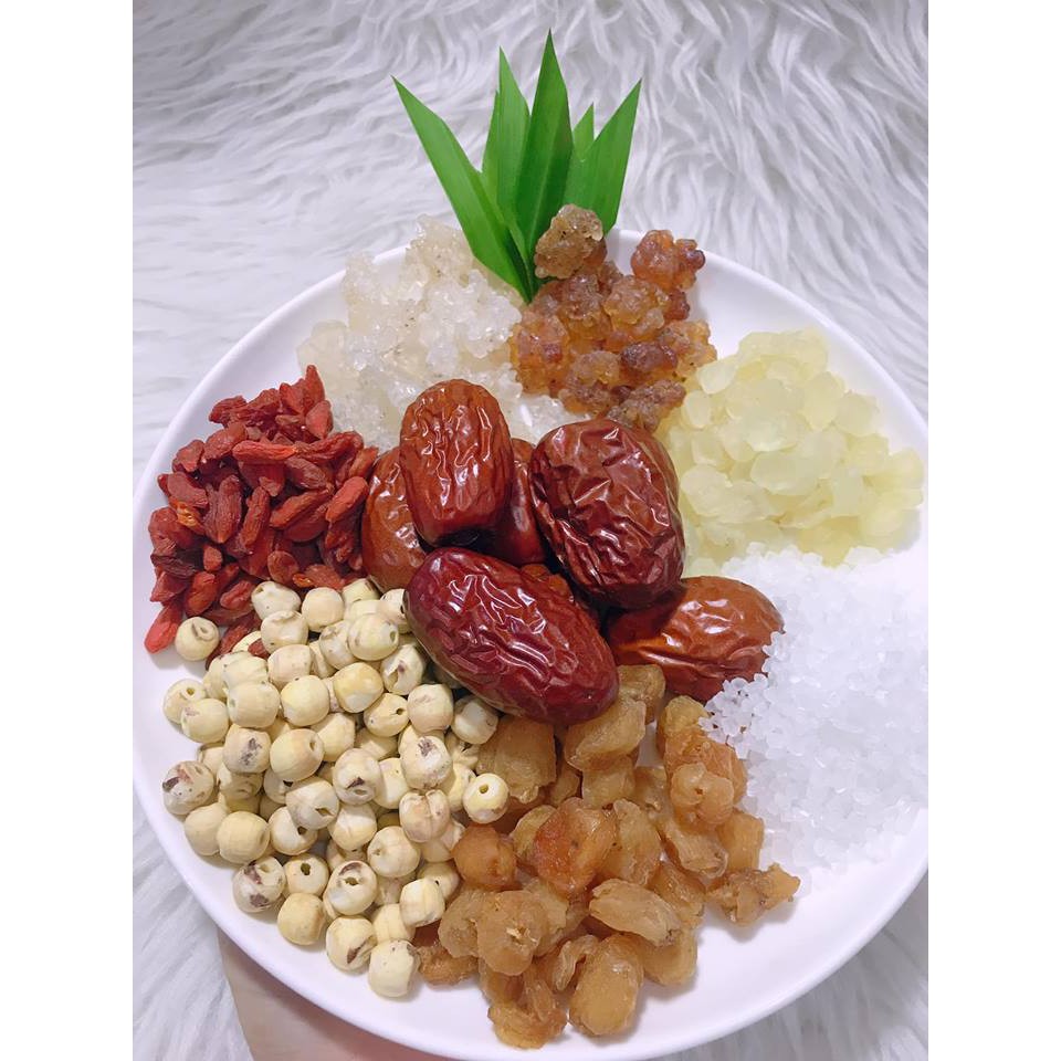 ️⚡️ Nguyên liệu của set: - Tuyết yến: 10g - Nhựa đào: 10g - Bồ Mễ: 10g - Long nhãn: 50gr - Hạt sen: 30gr - Hồng táo: 40gr - Kỉ tử đỏ: 20g - Hạt chia: 30gr Set nấu chè dưỡng nhan 230gr nấu 5-7 lit nước Mấy chị về đỗ ra rửa sơ cho sạch để ráo nước rồi nấu nha. Này để tủ lạnh. Lạnh lạnh ăn ngon mà mát lắm. Chè dưỡng nhan đang hot rần rần đó ạ. ?? Hướng dẫn chi tiết cách nấu: CHÈ DƯỠNG NHAN (tuyết yến, nhựa đào, sen tuyết, kỉ tử, táo đỏ, long nhãn, quế hoa) - KHẨU PHẦN 3 - 4 người ăn ⚡️Cách sơ chế tuyết yến, nhựa đào: - Tuyết yến, nhựa đào ngâm tối thiểu từ 12 - 15h (cho vô hộp bỏ ngăn mát tủ lạnh hoặc có thể để ngoài nếu thời tiết mát mẻ ạ! Khi tuyết yến, nhựa đào nở hết thì các mẹ khoắng chỗ tuyết yến nhựa đào ấy theo chiều vuông góc với đáy bát (đáy hộp) - để cặn, tạp chất xuống hết đáy, để một lúc cho dễ lọc) ❌❌❌ LƯU Ý: tuyết yến các mẹ phải cho ra rá, xả nhiều lần trên vòi nước tới khi hết mùi chua của tuyết yến khi chưa sơ chế nha! Và nhựa đào nếu các mẹ muốn giòn, thì cỡ 5h lại bỏ ra tách hết phần nhựa đào đã nở, cho ra rá (hoặc đồ gì ráo kiệt nước, lúc nấu chỉ việc đã cặn hoặc rửa nhựa đào sẽ rất giòn, và không nên ngâm nhựa đào quá lâu nhựa đào sẽ mềm và hơi nhớt!) ⚡️ Sơ chế các nguyên liệu khác và cách nấu: - Sen tuyết ngâm trước khi nấu 2h! Khi nấu không đổ nước ngâm đi mà dùng cả! - Hồng táo: thái lát sẵn, hoặc mọi người thích có thể bổ đôi, hoặc để nguyên quả nhưng phải khía ra để táo ngấm (nhà tớ hay để nguyên quả chia cho dễ) :::))) - Cho nước vào nồi, cho đường phèn, long nhãn, táo đỏ vào đun sôi ~10p, sau đó cho tuyết yến, nhựa đào và sen tuyết vào ( lưu ý khi nấu tuyết yến chỉ đun thêm ~ 10p là được rồi ạ! Nếu đun lâu tuyết yến dễ tan trong nước, mà nhựa đào cũng mất độ giòn) - Sau khi tắt bếp, cho kỉ tử và lá dứa vào, khuấy đều, sau đó đậy vung tầm 10p rồi mở ra để nguội, cho vô tủ lạnh đợi chè mát ăn siêuuu ngon luôngggg! Hsd: 1 tháng #Cheduongnhan #Cheduongnhansieungon
