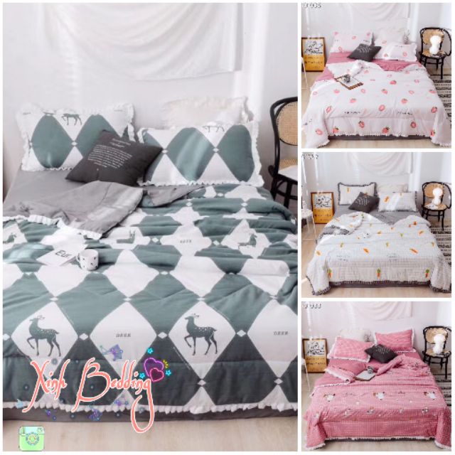 ️???Quá trời set đũi hè rồi mà nhìn các mẫu này e k kìm lòng được, lại nhập về phục vụ chị em. ?Toàn màu xinh xinh cute đáng yêu dã man. Chỉ cần trải 1 bộ này ra giường và ngả mình lên là quên hết nắng nôi, mệt mỏi luôn ạ. ?Chất vải đũi cao cấp vừa mềm mát, ai dùng cũng ưng. ?Chăn hè được trần tấm hiện đại nhẹ tênh. Kết hợp chăn và gối may diềm xếp ly cách điệu tỉ mỉ khiến cho sản phẩm độc đáo hơn so với tất cả các dòng trước đó. ?Giá dòng này nhỉnh hơn 1 chút nhưng cũng rất xứng đáng vì chất lượng thực sự của sản phẩm sẽ thay cho mọi lời quảng cáo ??? Trọn bộ 4 món: 1 ga tấm trải freesize + 2 vỏ gối đầu + 1 chăn trần hè ♥️♥️♥️