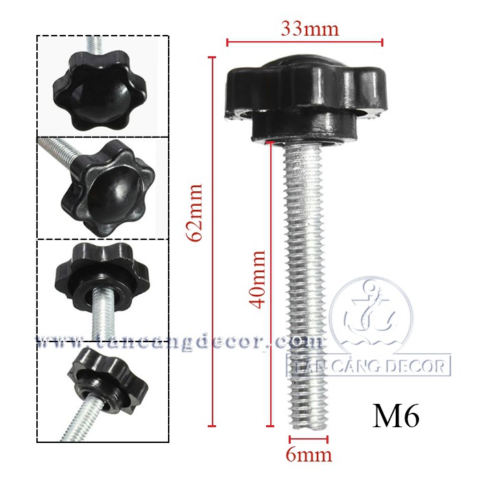 ️Núm Khóa Vặn M6 - M8 - M10 - Chất Liệu : Nhựa Tổng Hợp, Sắt. - Kích Thước : M6 x 33 x 40 mm - M8 x 38 x 40 mm - M10 x 40 x 50 mm. - Đơn Giá bán 1 Cái. - Sản phẩm chuyên dụng thay thế cho các bulong vặn thông thường giúp ta có thể điều chỉnh lực bằng tay mà không cần đến dụng vụ vặn như cờ lê, mỏ lết, kiềm hay bất cứ dụng cụ mở nào khác.