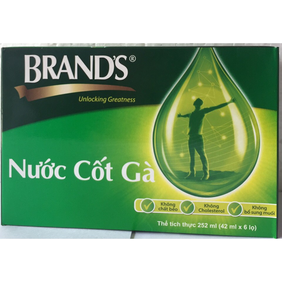 ️Tăng cường sức khỏe.Thúc đẩy năng lực trí tuệ. Hỗ trợ sự tập trung và tăng cường trí nhớ. Giúp cơ thể phục hồi trong những lúc mệt mỏi. Tăng cường hệ miễn dịch. Hỗ trợ hoạt động tuần hoàn máu. 6 hũ x 42ml 1. Thành phần: - Nước Cốt Gà ( 99,7%), chất tạo màu Caramel I ( nguồn tự nhiên) bao gồm các axit amin thiết yếu và các axit amin phức hợp: Canosine, Anserine, ProPeptigenTM và các Vitamins & khoáng chất ( Vitamin B5, Vitamin B3, Choline, Sodium, Kali, Canxi, Sắt, Clo...) * Lợi ích: - Tăng cường sức khỏe. - Thúc đẩy năng lực trí tuệ. - Hỗ trợ sự tập trung và tăng cường trí nhớ. - Giúp cơ thể phục hồi trong những lúc mệt mỏi. - Tăng cường hệ miễn dịch. - Hỗ trợ hoạt động tuần hoàn máu. 2. Tác dụng: - Người lớn: giảm sự mệt mỏi về thể chất và tinh thần để đương đầu với cuộc sống bận rộn hằng ngày. - Người mang thai: cải thiện chất lượng và số lượng sữa. - Học sinh, sinh viên: giảm sự lo lắng & chống buồn ngủ khi thức đêm và khi đi thi. Cải thiện trí nhớ và sự tập trung. 3. Cách dùng: Giữ nóng và uống trực tiếp từ lọ. Tuy nhiên, có thể uống Nước Cốt Gà BRAND’S® theo nhiều cách sau tùy thuộc vào sở thích: - Uống trực tiếp từ lọ, uống nóng hoặc uống lạnh - Pha thêm nước ấm để uống hoặc dùng chung với thức ăn. *Liều dùng: - Uống hằng ngày để tăng cường sức khỏe và trí não: mỗi ngày 1 lọ - Trong giai đoạn làm việc căng thẳng, học thi, lao động trí óc mệt mỏi: mỗi ngày 1 lọ lớn hoặc 2 lọ nhỏ. *Xuất xứ: Công ty Brand's Suntory(Thailand) Co., Ltd-Thái Lan. 4. Hạn sử dụng: Ba năm từ ngày sản xuất.