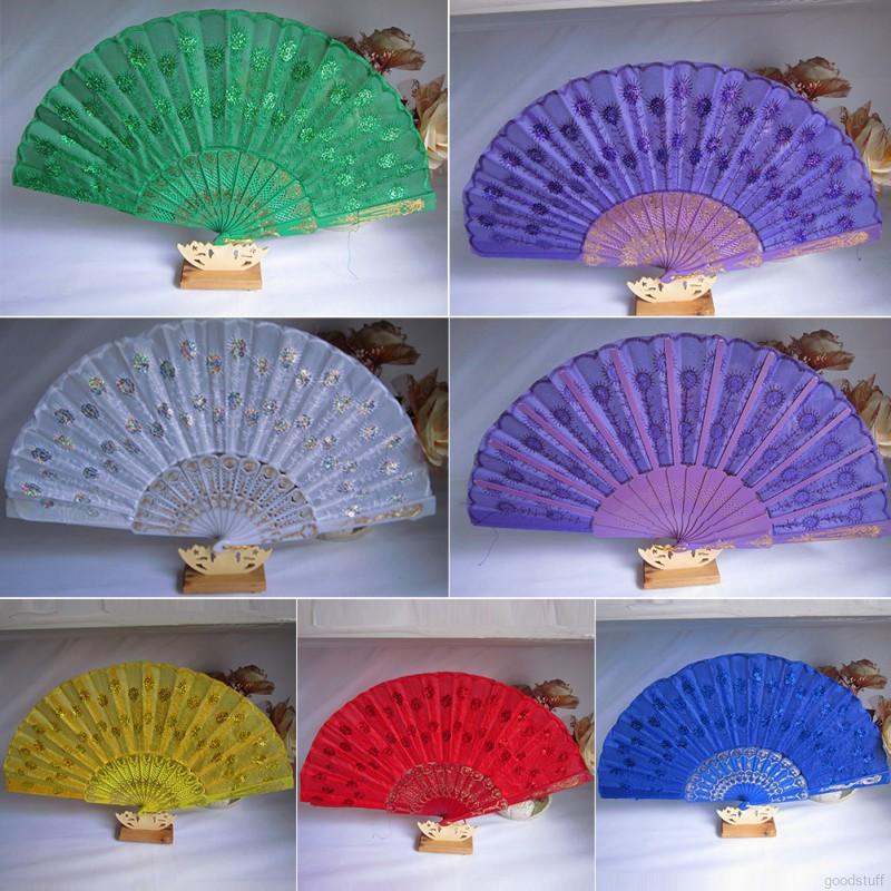️Description Length of fan:23CM/ 9.1" (approx). Color Available:White/Purple/Green/Blue/Yellow/Red Material:Fabric+Plastic Features:Embroidered+Sequins Package included : 1 x Folding Hand Held Fan