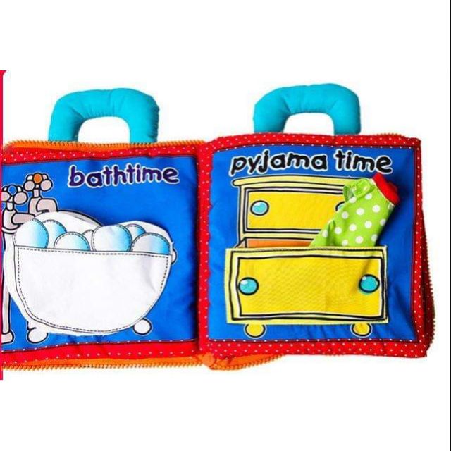 ️=> Cuốn sách này nói về hoạt động buổi tối của chú gấu con trước giờ đi ngủ bạn gấu sẽ làm những gì➥ Câu chuyện liệt kê những việc bạn gấu làm đó là: uống nước, đánh răng, tắm, thay quần áo ngủ, đọc sách, lên giường ngủ. Bé tự tay giúp bạn gấu đánh răng, tắm,... bé sẽ rất hứng thú Thông qua câu chuyện bố mẹ có thể hướng dẫn bé áp dụng những việc giống như bạn gấu để bé làm theo mà bố mẹ không cần phải nhắc nhở nhiều. =>Ưu điểm của sách vải là + Con tha hồ sờ, cảm nhận, vò mà không sợ bị rách. + Có thể giặt liên tục không ảnh hưởng đến chất lượng sách. + Trong các cuốn sách vải hay được thiết kế hình ảnh, màu sắc bắt mắt= > Kích thích thị giác cho bé. + Khi cầm, hay lật sách luôn phát ra các tiếng sột soạt => kích thích thính giác và xúc giác cho bé. + Mỗi quyển sách có 1 nội dung câu chuyện khác nhau phụ thuộc vào nhu cầu của từng gia đình. + Sách an toàn sau khi mua về mẹ giặt rùi cho bé tha hồ gặm. => Sách vải an toàn của hãng BBSKY xuất khẩu.