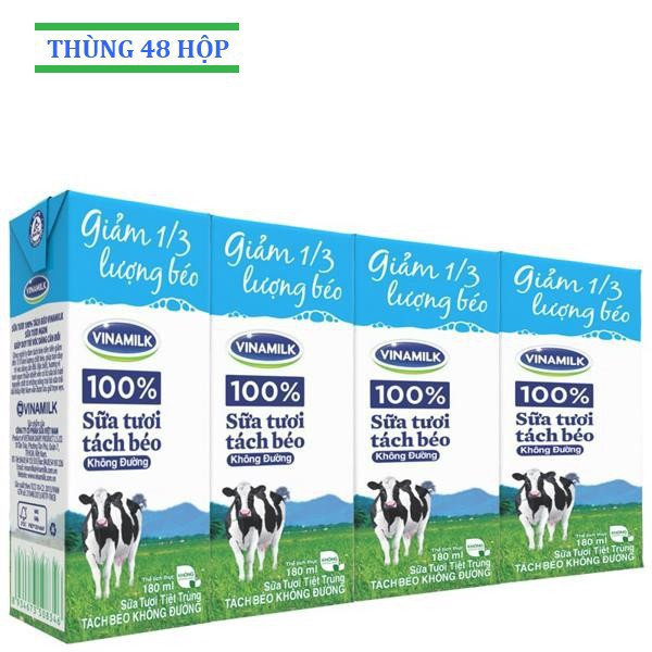 ️***Shop sẽ cộng điểm vào mã Khách hàng thân thiết Vinamilk của quý khách (dựa theo số điện thoại di động của từng đơn hàng). Quý khách sẽ được hưởng các quyền lợi do Vinamilk quy định*** Vui lòng xem thể lệ trong hình. Không áp dụng cho sản phẩm cho Bé dưới 2 tuổi. SỮA TƯƠI TIỆT TRÙNG VINAMILK 100% TÁCH BÉO KHÔNG ĐƯỜNG - THÙNG 48 HỘP X 180ML Quy cách thùng: 12 lốc/thùng Làm từ 100% sữa bò tươi Được chế biến bằng công nghệ ly tâm tách béo tiên tiến Giảm đến 1/3 lượng chất béo Giúp duy trì vóc dáng cân đối