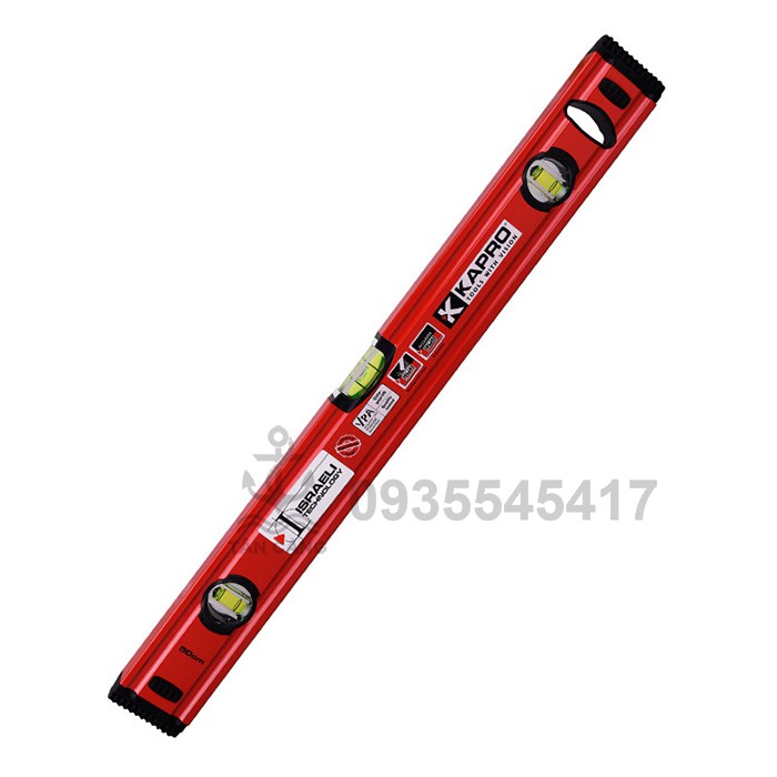 ️- Kích thước : 40 cm - 60 cm - 80 cm - 90 cm KAPRO TOOL (Kapro.com) Thương hiệu hàng đầu tại Isarel có trụ sở tại Hoa Kỳ và Công ty Liên doanh tại Mỹ. 30 năm nghiên cứu và phát triển các sản phẩm chuyên dụng các sản phẩm dụng cụ đo chính xác. Sản phẩm thước thủy cân bằng Kapro được sản xuất trên dây chuyền công nghệ cao với các tính năng vượt trội: - 03 Mực nước thăng bằng tích hợp trên 1 thân thước - Thân bằng thép cán nguội chắc chắn - Chất lỏng thăng bằng được làm từ dầu chuyên dụng với công nghệ chống sốc độc quyền - không gây bọt giúp quá trình sử dụng luôn ổn định và chính xác - Hai đầu được lắp cao su dẻo đảm bảo thước dù có rơi cũng không hỏng hoặc móp đầu - Phần mặt thẳng áp vào vật thể cần đo được gia công kỹ lưỡng và thẳng tăng cao độ chính xác SẢN PHẨM ĐẠT TIÊU CHUẨN LƯU HÀNH TOÀN CẦU - MÃ VẠCH 729 GS1 Israel