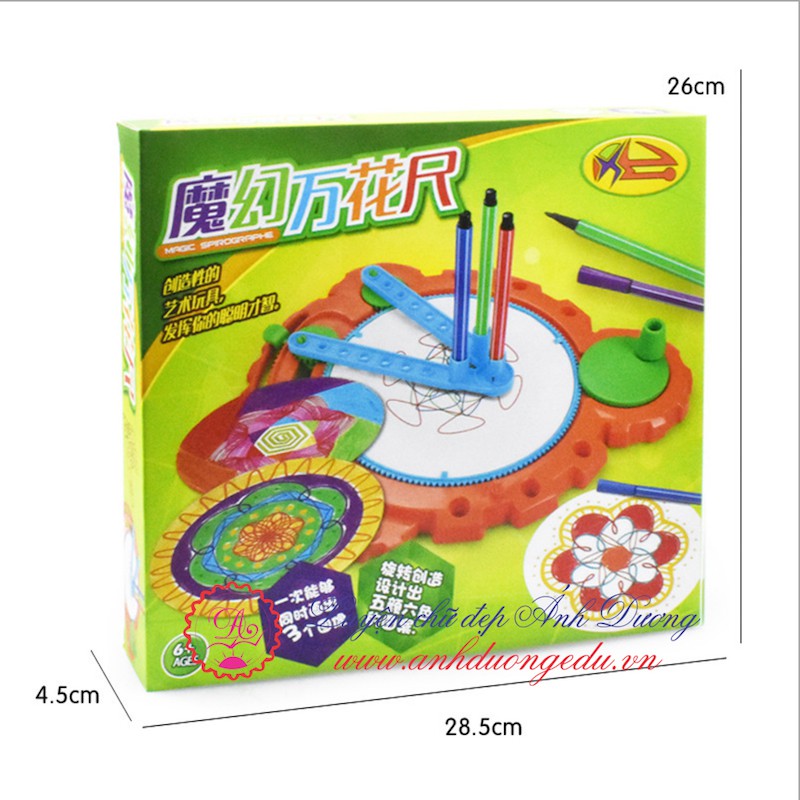 ️THƯỚC VẼ SÁNG TẠO QUAY TAY COLOR SPINOUNT - 1 món đồ chơi trí tuệ vô cùng độc đáo có thể coi là một loại đồ chơi tài năng chỉ với cây bút màu sắc, 1 chiếc bàn quay có các lỗ cắm bút sẽ tạo ra vô vàn những hình nghệ thuật và đẹp mắt - Bộ sản phẩm thước vẽ sáng tạo quay tay Color Spinout gồm 1 hộp kích thước 4,5x28,5x26cmcm, 1 bàn quay có sẵn các điểm với những góc độ khác nhau , sách hướng dẫn sử dụng, tập giấy đã cắt hình tròn và 1 miếng bìa mẫu để khi dùng hết có thể làm khuôn cắt giấy khác, bộ 6 cây bút với 6 màu khác nhau - Với bộ đồ chơi này có thể chơi cho các bé từ trên 3 tuổi cho đến cả người lớn giúp tăng cường khả năng viết, vẽ, di chuyển, phát triển trí thông minh, chỉ việc đặt bút vào 1 vị trí, cầm cần trục quay theo hướng cố định là đã tạo thành vô vàn các hình thù khác nhau tuỳ theo ý thích (với trẻ nhỏ khi chơi cần có sự hướng dẫn của người lớn) - Đồ chơi nghệ thuật sáng tạo dùng để chơi tăng cường sự khéo léo và sự phân tích hình học. CÁCH SỬ DỤNG: B1: Cho giấy vào bàn đựng giấy sao cho giấy được gim cố định ở các nấc B2: Đặt vị trí bánh răng và tay cầm theo góc độ nhất định B3: Cắm bút vào 1 trong 3 lỗ ở giữa bàn B4: Dùng tay xoay theo 1 chiều cố định Xoay hết vòng có thể đổi vị trí và đổi màu sau đó tô theo ý thích hoặc sáng tạo thêm các hình