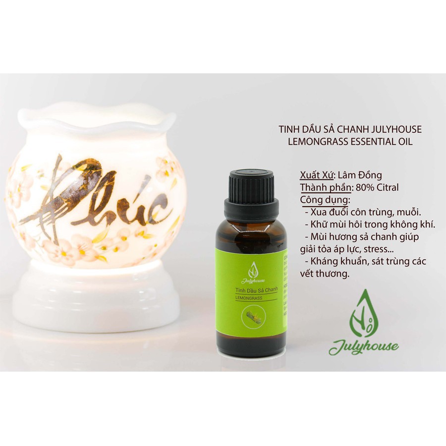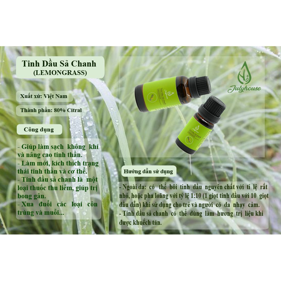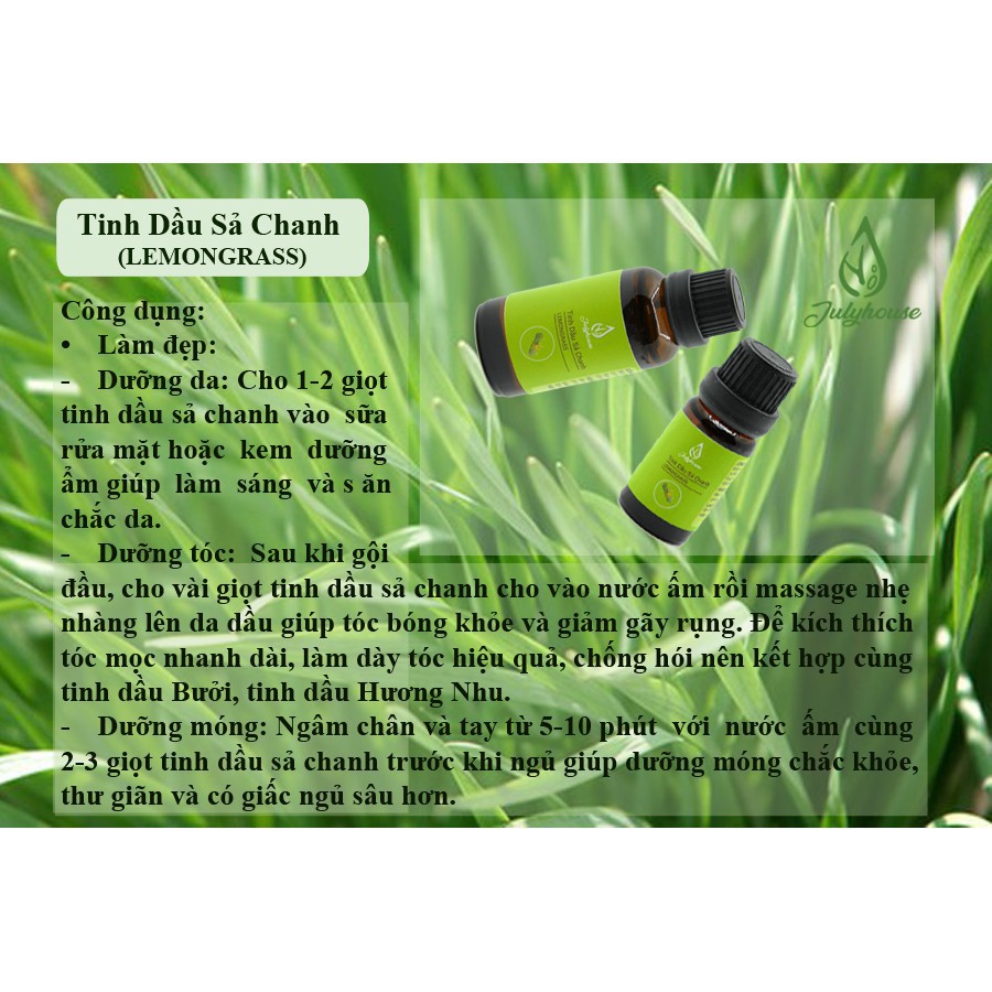 ️Tinh dầu Sả Chanh Julyhouse Mô tả sản phẩm Tinh dầu Sả Chanh Julyhouse • Thành phần: chiết xuất 100% tự nhiên từ cây Sả chanh – Lemongrass, mùi sả nồng cùng hương chanh nhẹ nhàng. • Khử mùi, đuổi côn trùng, điều trị cảm lạnh, đau đầu. • Xuất xứ: Việt Nam • Quy cách: lọ 30ml Công dụng và hướng dẫn sử dụng Tinh dầu Sả Chanh Julyhouse • Giải tỏa căng thẳng mệt mỏi: - Cho 1-3 giọt Tinh dầu Sả Chanh vào máy khuếch tán hoặc đèn đốt tinh đầu có chứa sẵn nước. - Nếu không có thời gian và điều kiện để khuếch tán, có thể cho một giọt tinh dầu vào lòng bàn tay, xoa nhẹ và hít thở đều trong 30 giây hoặc lâu hơn để kích thích các giác quan và làm việc hiệu quả hơn. • Xua đuổi côn trùng: các hợp chất thuộc loại andehyt trong tinh dầu có khả năng xua đuổi muỗi, gián. - Cách 1: Nhỏ vài giọt tinh dầu sả chanh vào nước lau sàn nhà. - Cách 2: Cách đơn giản hơn đó là bạn có thể nhỏ 3 đến 5 giọt tinh dầu sả chanh và khăn bằng cotton rồi treo lên những vị trí có cần đuổi muỗi để mùi hương của chúng lan tỏa khiến loài muỗi không đến gần. - Cách 3: Pha tinh dầu sả chanh nguyên chất với cồn để theo tỷ lệ 30 tinh dầu sả với 70 cồn y tế 70 độ rồi cho vào bình xịt để đuổi muỗi. • Làm đẹp: - Dưỡng da: Cho 1-2 giọt tinh dầu sả chanh vào sữa rửa mặt hoặc kem dưỡng ẩm giúp làm sáng và săn chắc da. - Dưỡng tóc: Sau khi gội đầu, cho vài giọt tinh dầu sả chanh cho vào nước ấm rồi massage nhẹ nhàng lên da dầu giúp tóc bóng khỏe và giảm gãy rụng. Để kích thích tóc mọc nhanh dài, làm dày tóc hiệu quả, chống hói nên kết hợp cùng tinh dầu Vỏ Bưởi, tinh dầu Hương Nhu. - Dưỡng móng: Ngâm chân và tay từ 5-10 phút với nước ấm cùng 2-3 giọt tinh dầu sả chanh trước khi ngủ giúp dưỡng móng chắc khỏe, thư giãn và có giấc ngủ sâu hơn. • Làm dầu massage: tinh dầu sả chanh có tác dụng làm giảm đau nhức xương, khớp. Với chất dầu lỏng, nhẹ tinh dầu sả chanh được thường sử dụng trong spa. • Pha loãng tinh dầu sả chanh với dầu dẫn xuất như jojoba, đậu nành, hạt nho, dầu dừa, dầu olive… theo tỉ lệ 10-15 giọt tinh dầu nguyên chất với 30ml dầu dẫn xuất. Để tiết kiệm hơn, bạn cũng có thể dùng Johnson’s Baby Oil. Sau đó, dùng dầu massage nhẹ nhàng vào các cơ, khớp. • Tăng vị độc đáo trong ẩm thực: dùng trong pha chế đồ uống (trà, nước giải khát) và các món khai vị, món kho. Có thể dùng để thay thế khi không có chanh tươi hoặc những món ăn cần hương chanh nhẹ. Ngoài các cách dùng trên, có thể sử dụng tinh dầu sả chanh làm nước hoa, xà phòng thơm, nến thơm, thuốc giải cảm, chữa ăn chậm tiêu, đầy bụng,… Lưu ý: có thể gây kích ứng với da nhạy cảm. Tránh sử dụng ở các vùng da mỏng và nhạy cảm. Để xa tầm tay trẻ em. Phụ nữ mang thai và cho con bú nên tham khảo ý kiến bác sĩ trước khi sử dụng Bảo quản: Nơi khô ráo, thoáng mát. Tránh tiếp xúc trực tiếp với ánh sáng. #tinhdausachanh #tinhdausa #tinhdaulemongrass #tinhdau #tinhdautam #tinhdauxong #tinhdauxongphong #tinhdaumassage