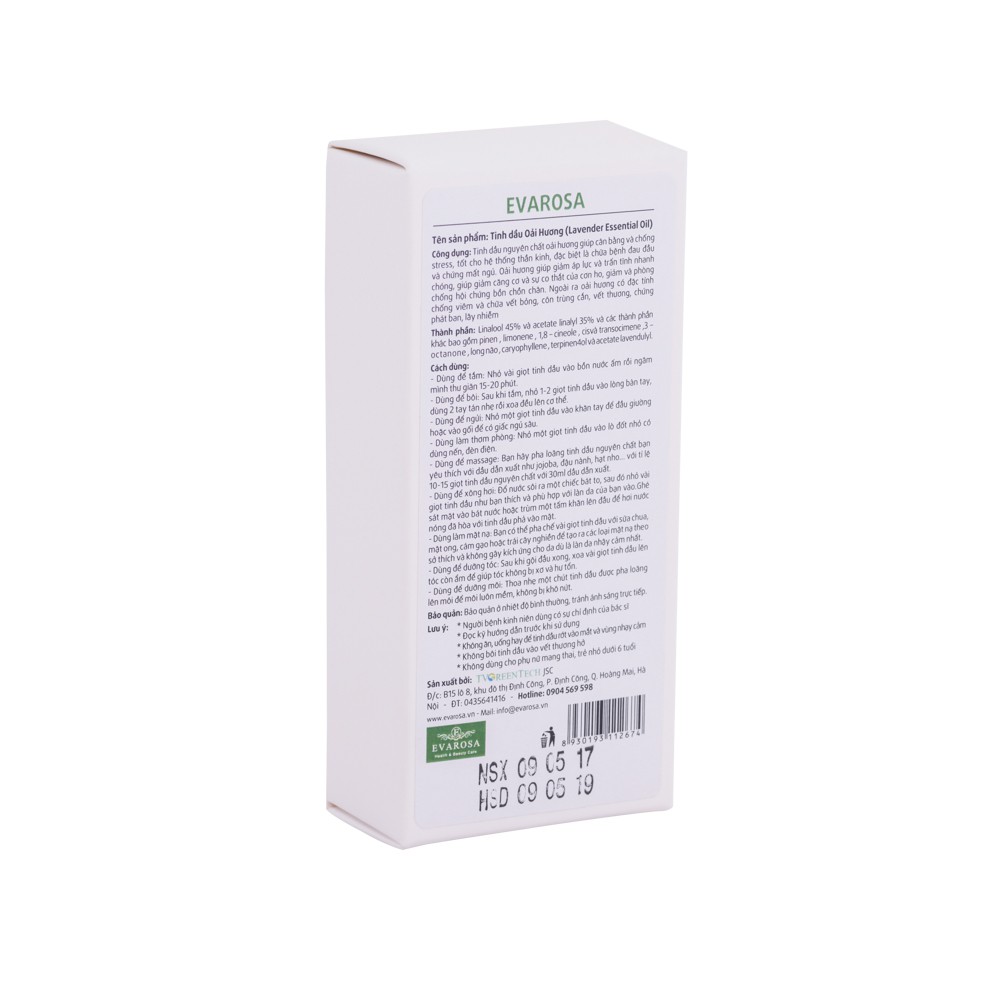 ️MÔ TẢ SẢN PHẨM Tinh dầu Oải hương EVAROSA Mô tả sản phẩm Tinh dầu Oải hương EVAROSA • Thành phần: chiết xuất 100% từ nụ hoa Oải hương. • Không chất bảo quản, không chất tạo màu, tạo mùi. • Xuất xứ: Ấn độ. • Qui cách: Lọ 30ml. Công dụng và hướng dẫn sử dụng Tinh dầu Oải hương EVAROSA: Với hương thơm đặc biệt dễ chịu, tinh dầu oải hương là một loại thần dược cho sức khỏe có khả năng giảm chứng căng thẳng, giảm đau, tăng cường lưu thông máu và điều trị một số bệnh liên quan đến đường hô hấp. Ngoài ra, tinh dầu còn được sử dụng để tạo mùi thơm trong các sản phẩm như nước hoa, xà phòng, lotion dưỡng da,… • Xua đuổi côn trùng: Cho 3-4 giọt tinh dầu oải hương vào máy khuếch tán hoặc đèn đốt tinh dầu chứa sẵn nước. Mùi hoa oải hương có tác dụng mạnh, xua đuổi nhiều loại côn trùng như muỗi và bướm đêm. Hơn nữa, tinh dầu hoa oải hương có chất chống viêm sẽ làm giảm kích ứng và ngứa với những vêt đốt của côn trùng. • Trị mụn trứng cá hiệu quả: Tinh dầu hoa oải hương ức chế vi khuẩn gây nhiễm trùng với mụn đang sưng tấy, điều tiết tuyến bã nhờn bằng thao tác nội tiết tố và có thể làm giảm các vết thâm sau khi điều trị mụn bằng cách kết hợp một lượng nhỏ tinh dầu oải hương vào bước dưỡng da hằng ngày. • Giảm đau Pha loãng 2-3 giọt tinh dầu oải hương cùng với nước ấm, massage nhẹ nhàng lên vùng da đau nhức. Tinh dầu hoa oải hương được biết đến như là một phương thuốc tuyệt vời giúp chữa nhiều cơn đơn khác nhau như căng cơ, đau nhức cơ bắp, thấp khớp, bong gân, đau lưng,… • Điều trị rối loạn hô hấp: Với tính kháng khuẩn mạnh, tinh dầu oải hương được sử dụng bằng cách xông hơi hoặc thoa trực tiếp lên vùng da ở cổ, ngực và lưng giúp điều trị các căn bệnh cảm cúm, ho, cảm lạnh, hen suyễn. Do đó, tinh dầu hoa oải hương thường được thêm vào các sản phẩm trị ho khan, ho có đờm. • Chữa chứng hói đầu: Tinh dầu hoa oải hương rất hữu ích trong điều trị rụng tóc. Một nghiên cứu của Scotland, hơn 40% bệnh nhân rụng tóc trong nghiên cứu này đã báo cáo tóc họ mọc nhanh hơn khi thường xuyên massage tinh dầu hoa oải hương vào da đầu hoặc có thể kết hợp 2-3 giọt tinh dầu cùng với dầu gội đầu như một biện pháp phòng ngừa rung tóc và giúp thư giãn. • Giúp thư giãn, tạo giấc ngủ sâu: Tinh dầu hoa oải hương còn giúp trị những cơn mất ngủ, mang đến cho bạn một giấc ngủ ngon và sâu hơn. Dùng 2-3 giọt tinh dầu rồi thoa lên thái dương, trán và sau gáy rồi massage nhẹ nhàng. Với trẻ em hoặc những người có làn da mẫn cảm thì có thể nhỏ một vài giọt tinh dầu vào gối hoặc đầu giường để thưởng thức hương thơm của tinh dầu. Lưu ý: - Để xa tầm tay trẻ em. - Không dùng để uống trực tiếp. - Không sử dụng lên vết thương hở và vùng da nhạy cảm. - Trẻ em, phụ nữ mang thai và người mắc bệnh kinh niên cần tham khảo ý kiến bác sĩ trước khi sử dụng. Bảo quản: nơi khô ráo, thoáng mát. Tránh tiếp xúc trực tiếp với ánh sáng.